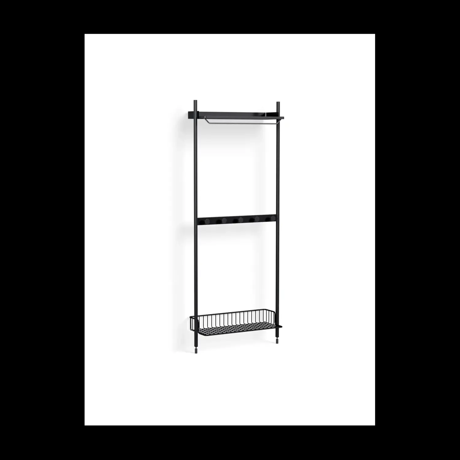 Den sorte farve og det enkle design passer ind i enhver indretning. Du får både en tøjstang til beklædning og en bundkurv til mindre genstande. Den robuste konstruktion i anodiseret stål sikrer, at reolen holder sig flot i mange år.