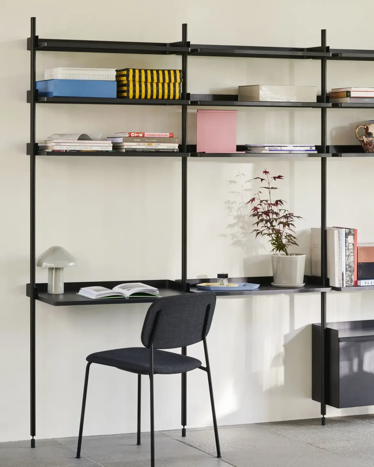 Den sorte finish passer ind i de fleste hjem, og den robuste konstruktion i anodiseret stål sikrer lang holdbarhed. Du får både åben og lukket opbevaring i ét møbel, der hjælper dig med at holde orden i hverdagen.
