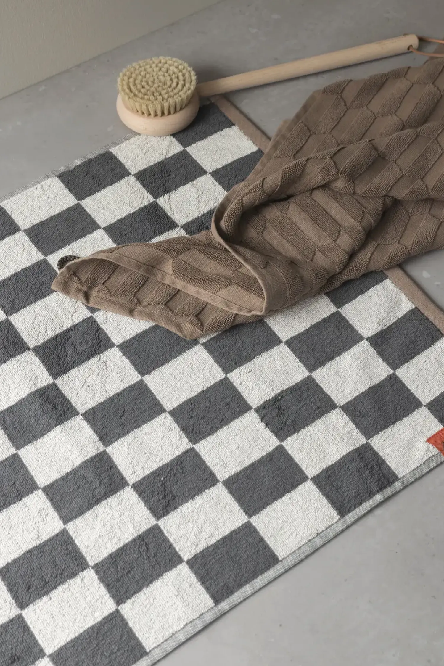 Giv dit badeværelse et stilfuldt løft med RETRO-bademåtten fra Mette Ditmer. Bademåtten kombinerer et skarpt grafisk look i mørkegrå og off-white med en lys brun kant, prydet med en orange strop og label. Fremstillet af 100% økologisk bomuld og certificeret af OEKO-TEX®, er RETRO-bademåtten blød mod dine fødder.
