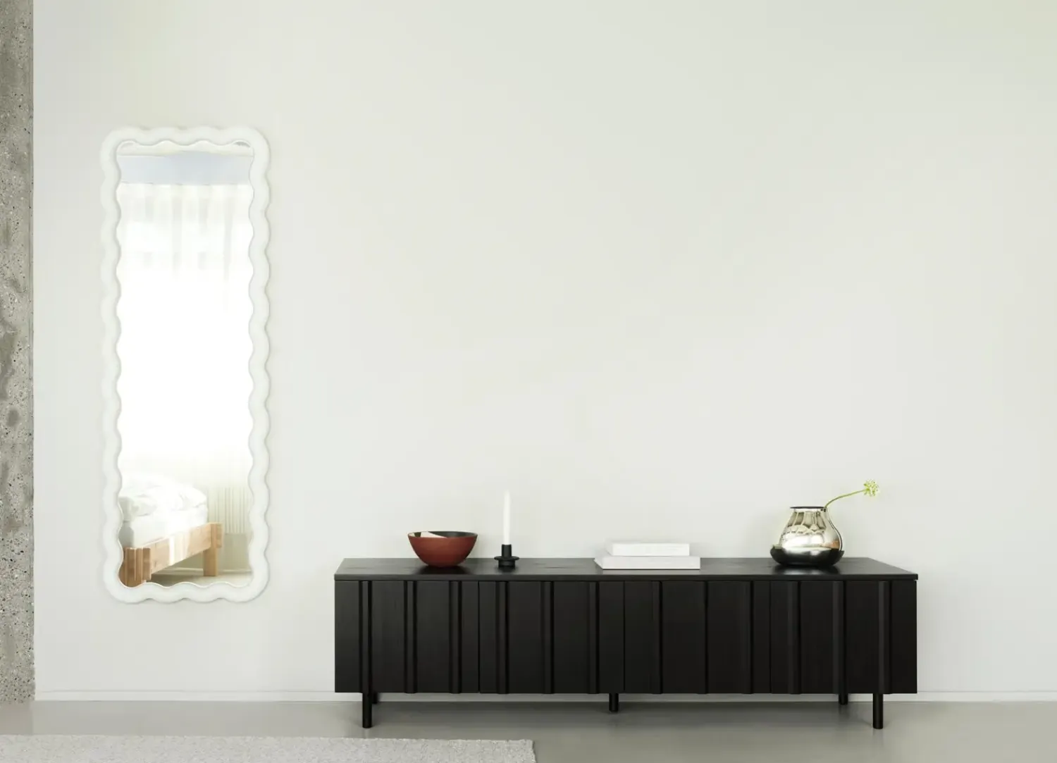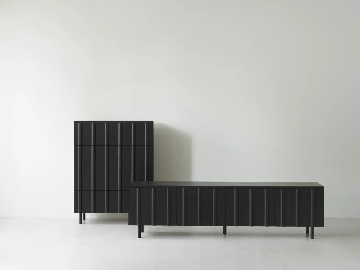 Denne lave skænk kombinerer praktisk opbevaring med et rent udtryk. De lodrette ribber på fronten skaber en karakteristisk profil, mens de cylindriske ben giver møblet et let udtryk. Skænken måler 175 cm i bredden, 48 cm i højden og 45 cm i dybden.