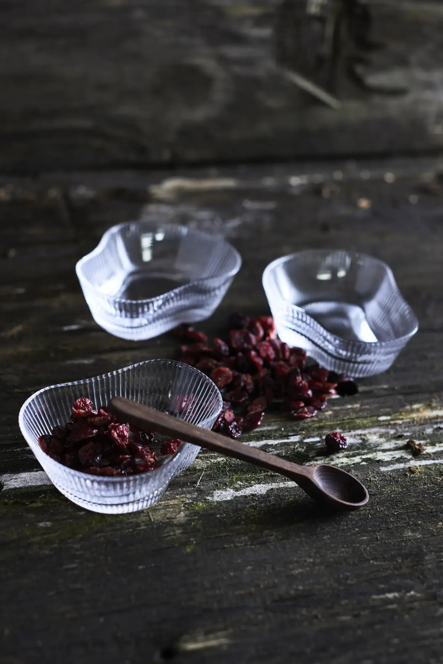Ripe glasskålene er en fusion af traditionelt håndværk og moderne æstetik. Den uregelmæssige form og det riflede glas skaber en interessant kontrast til bordets øvrige elementer.