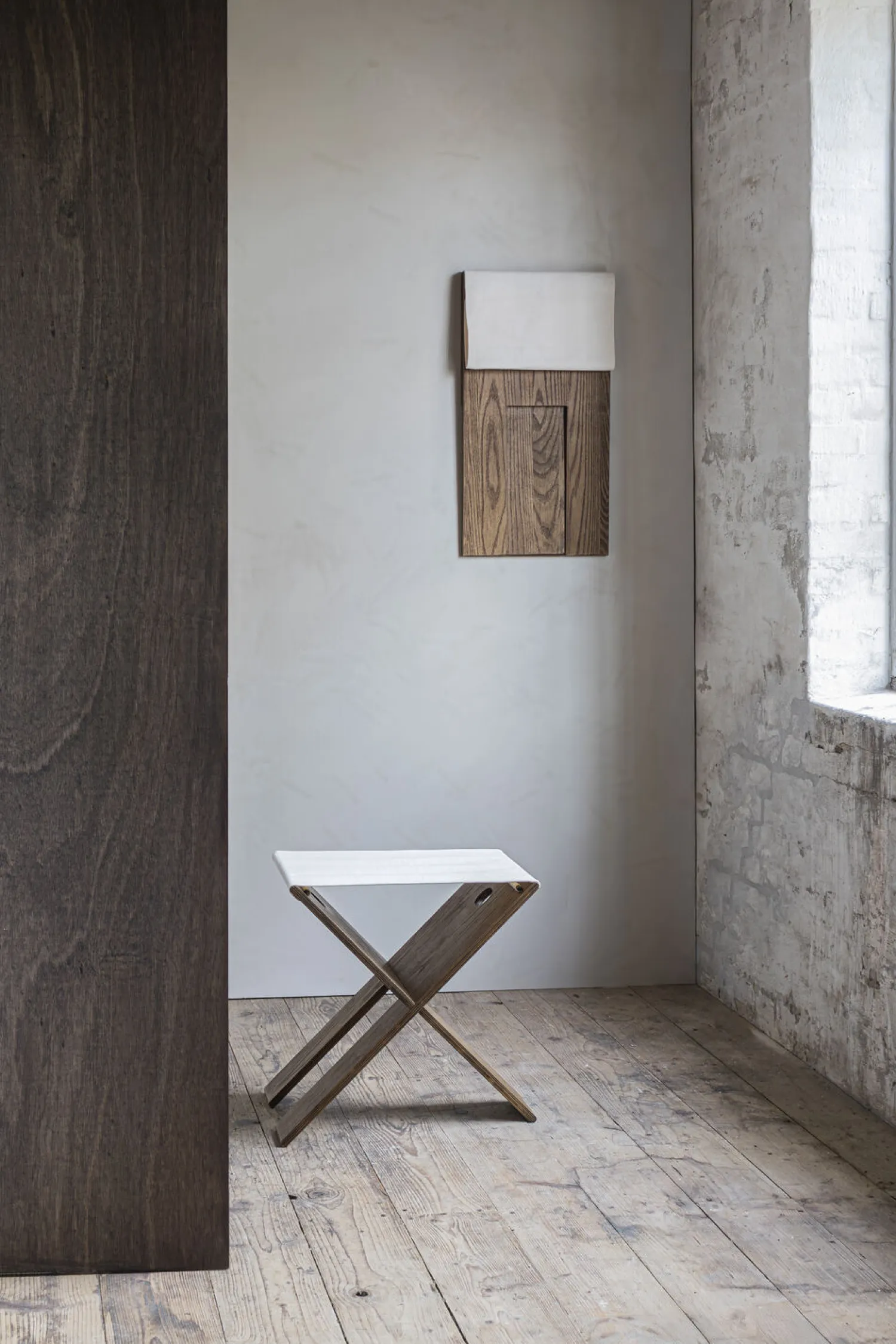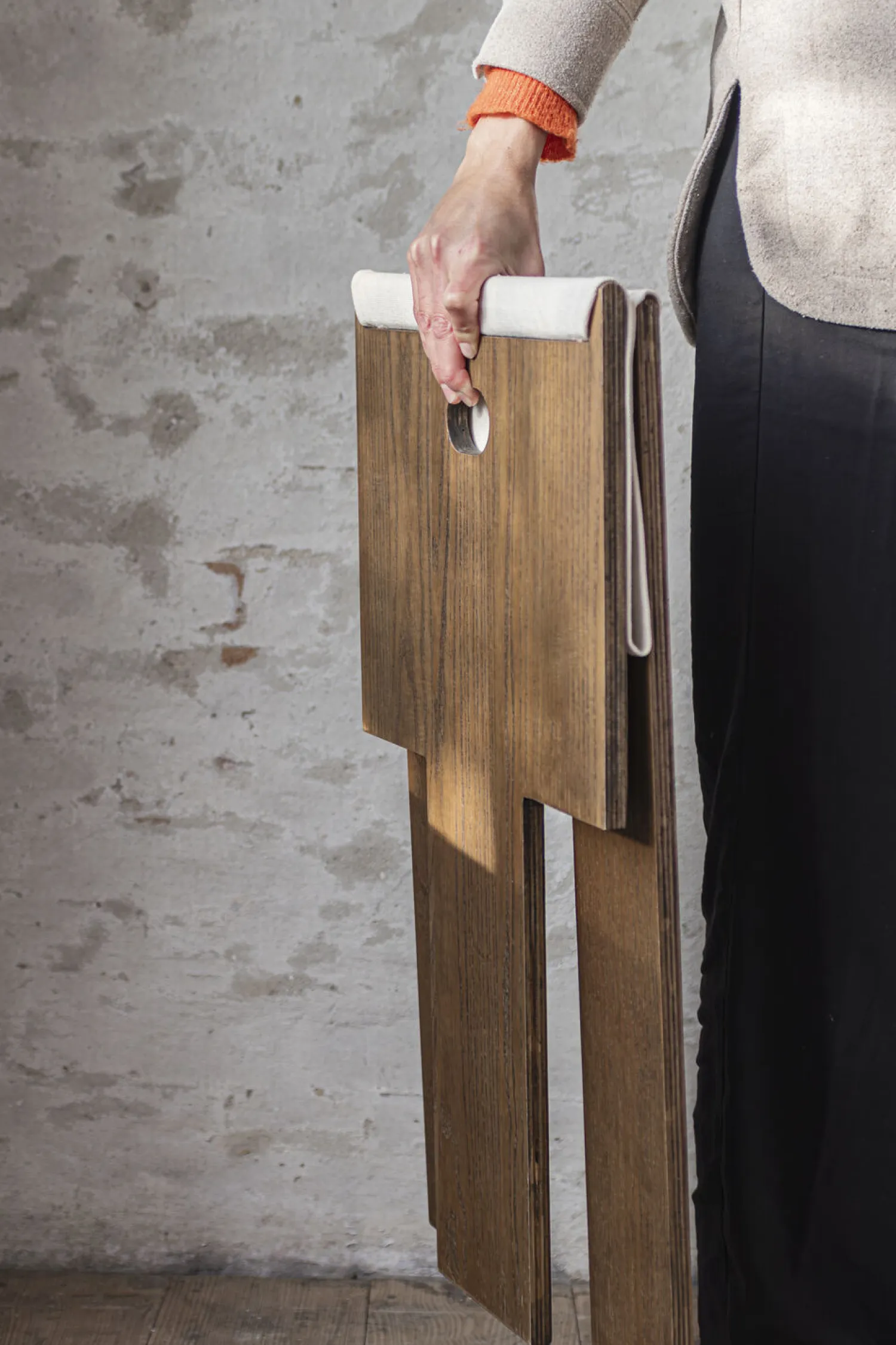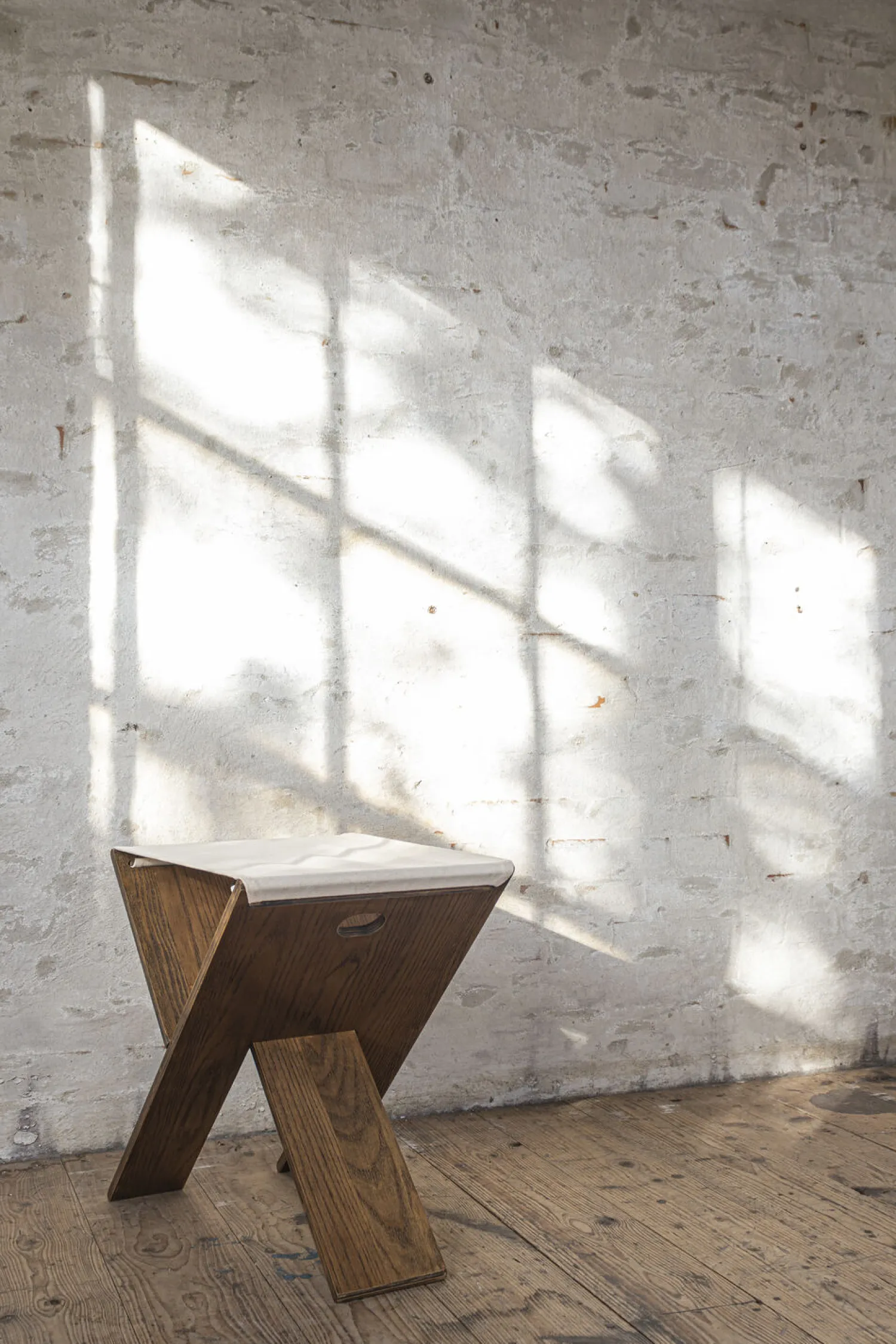 ROOTS-serien er designet med respekt for traditionelle håndværksprincipper, hvor funktionalitet og enkelhed går hånd i hånd. Serien tager os tilbage til rødderne med et tidløst design, der skærer alt unødvendigt væk og sætter praktik og kvalitet i første række. Med sine multifunktionelle løsninger og solide materialer, forener ROOTS æstetik og praktik i tidløse møbler der er skabt til at holde. Skamlen fra ROOTS-serien er praktisk og alsidig, og kan foldes sammen og enten opbevares diskret eller hænges dekorativt på væggen i håndtaget. Fremstillet i mørkolieret egetræsfiner med et slidstærkt canvas-sæde, kombinerer den funktionalitet og æstetik på smukkeste vis. Perfekt som en ekstra siddeplads til gæster, i entréen til at tage sko på, eller som en dekorativ base til en bakke eller et stilleben.Skamlen kan hænges op på væggen, hvor den fungerer som et dekorativt element, når den ikke er i brug – ideelt til små rum, hvor funktion og æstetik skal gå hånd i hånd. Den kommer i en praktisk flat pack og er designet til at være både funktionel og elegant i enhver indretning. Bæreevne (statisk vægt): 90 kg.