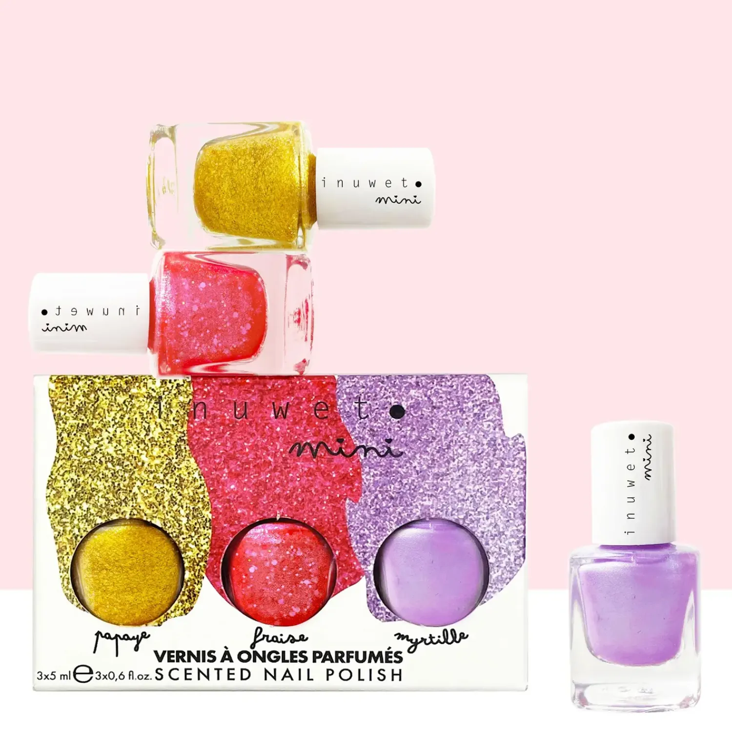 3 neglelak til børn i farven guld, lilla og lyserød, som dufter vidunderligt af hhv. papaya, blåbær og jordbær. En vegansk og naturlig formel. Disse neglelak er fremstillet i Frankrig med 82% vand for at beskytte vores børns negle. Let at fjerne med vand ved håndvask!