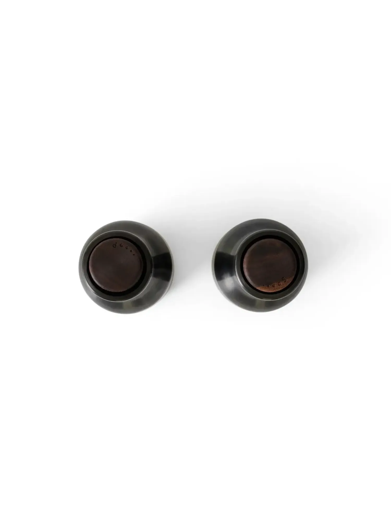 Det minimalistiske og moderne design gør disse kværne til en stilfuld tilføjelse til ethvert bord. Den mørke messingfinish og den matte overflade tilføjer et luksuriøst præg, mens den runde accent på toppen skaber et elegant udseende.