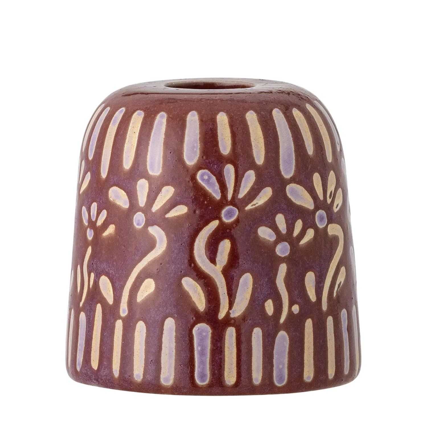Denne håndlavede lysestage i stentøj byder på en karakteristisk lilla farve med dekorative mønstre. Den reaktive glasur skaber fine blomster- og linjemønstre, der gør hver lysestage forskellig i sit udtryk.
