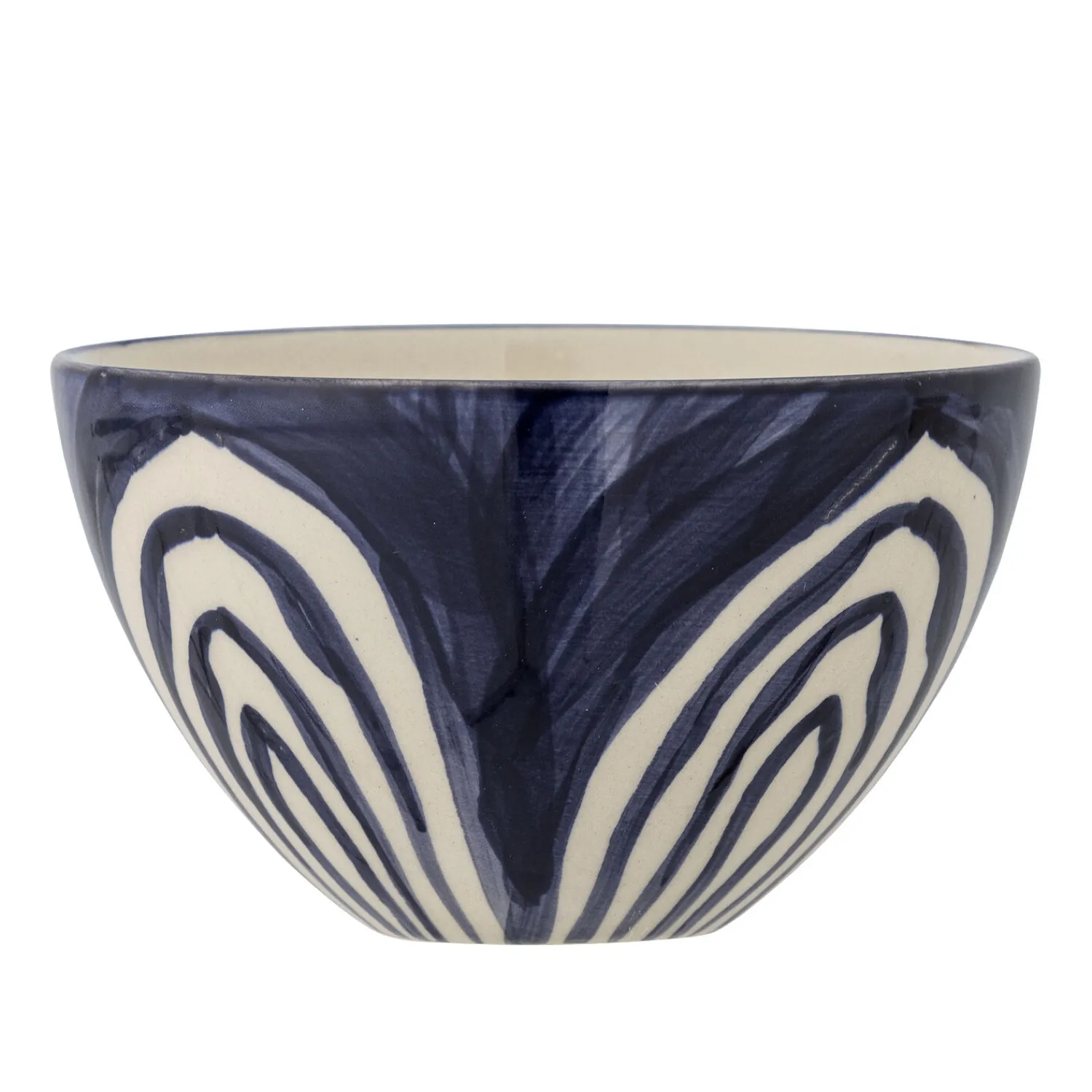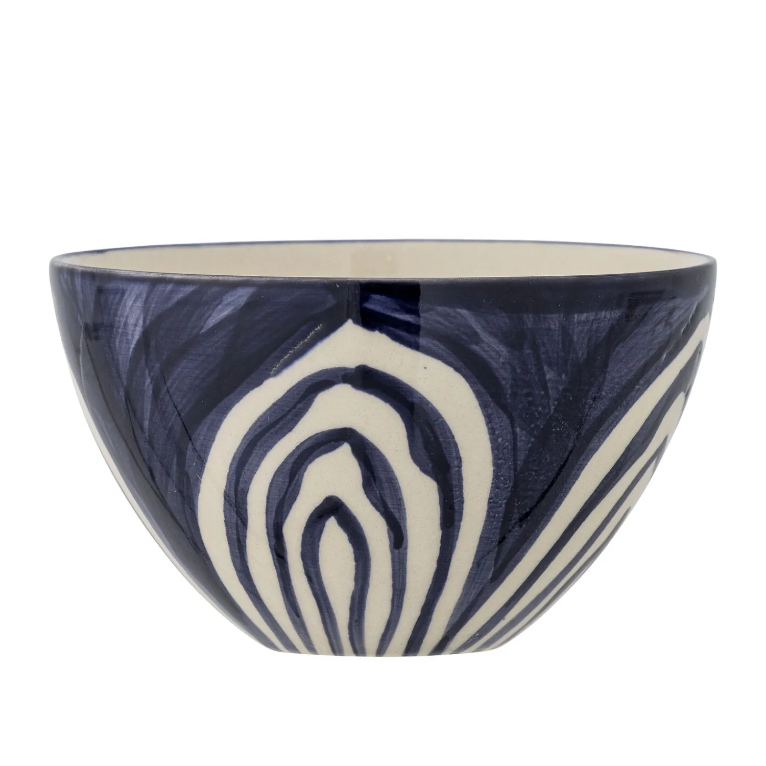 Denne hånddekorerede stentøjsskål fra Bloomingville har en diameter på 12 cm og en højde på 7,5 cm. Det blå og hvide mønster med snoede linjer giver hver skål sit eget unikke udtryk.
