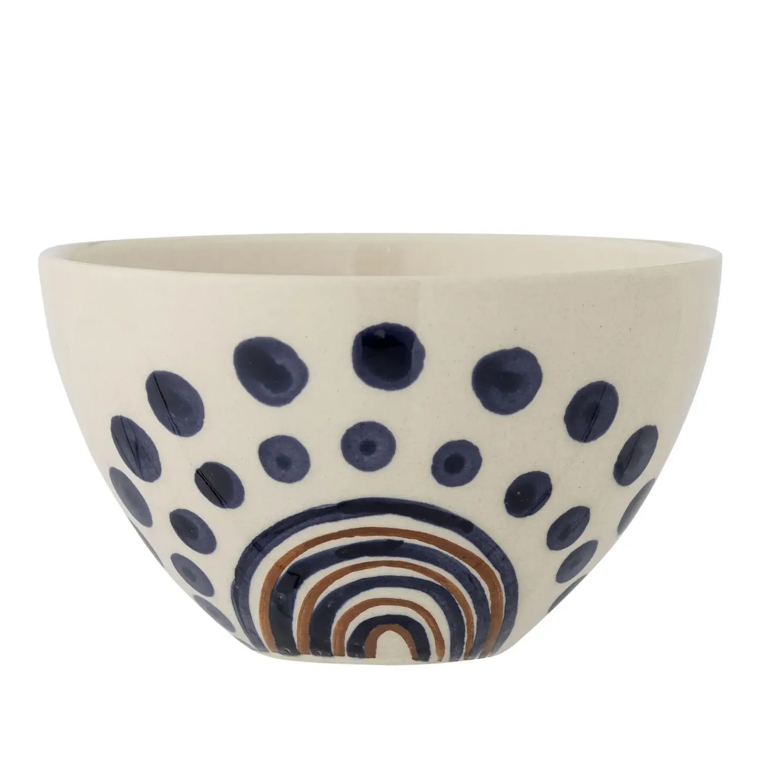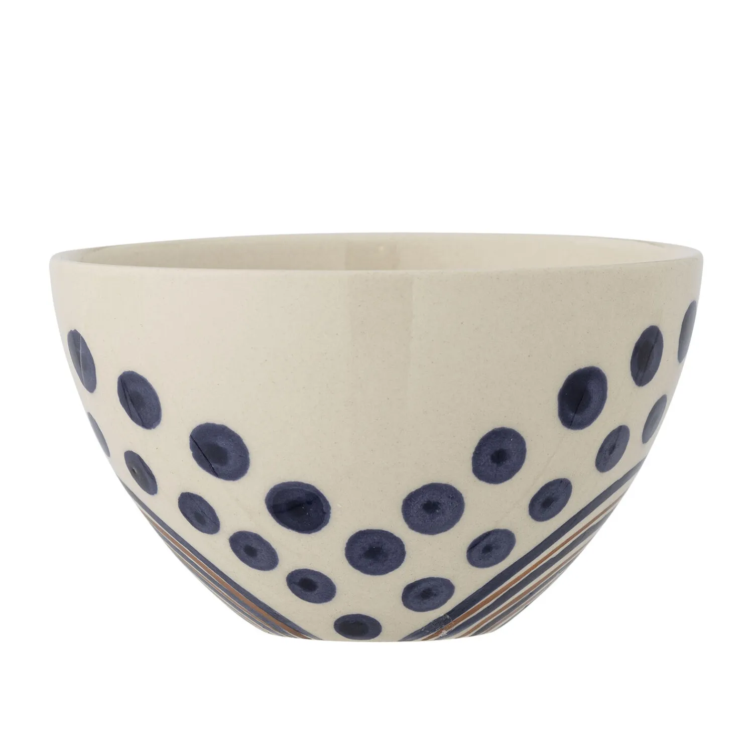 Skålens størrelse gør den velegnet til både morgenmad, snacks og tilbehør. Den håndlavede finish betyder, at hver skål har sit eget særpræg, hvilket giver din servering et personligt touch. Mønsteret med blå prikker skaber en fin kontrast.