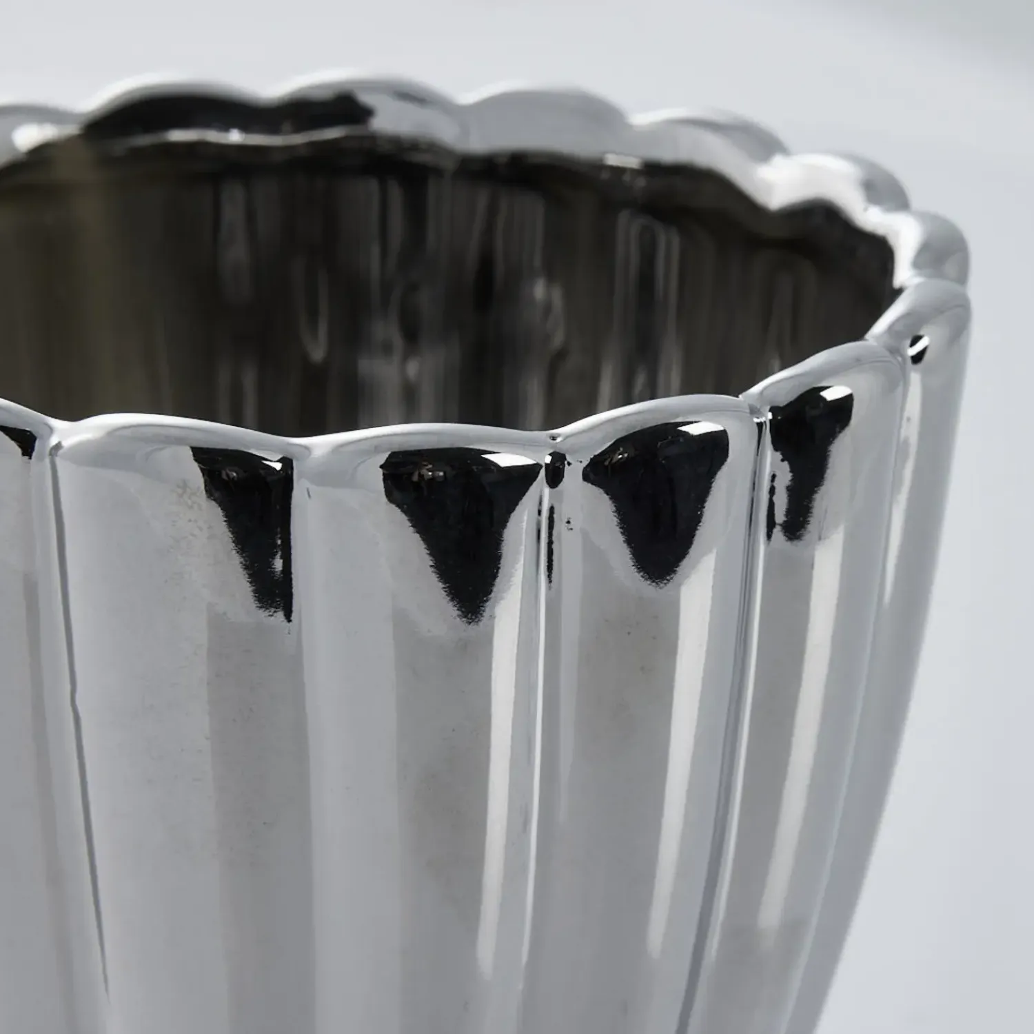 Shenella urtepotteskjuleren kendetegnes ved sine vertikale riller, der løber langs hele kroppen og skaber et interessant visuelt udtryk. Den blanke, sølvfarvede overflade har en reflekterende egenskab. Den let buede topkant giver et blødt præg til det ellers geometriske design.