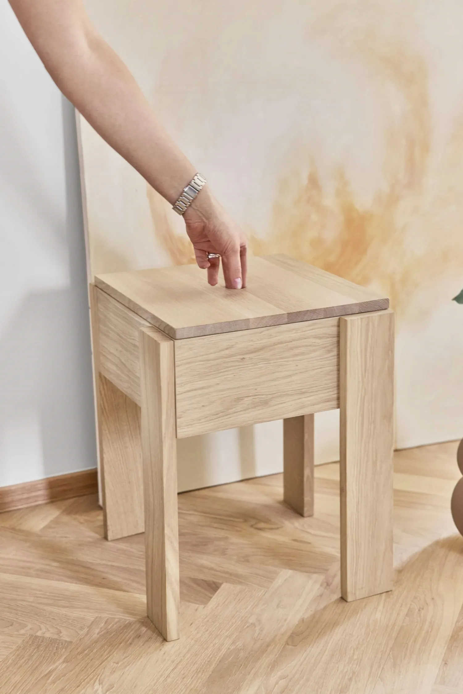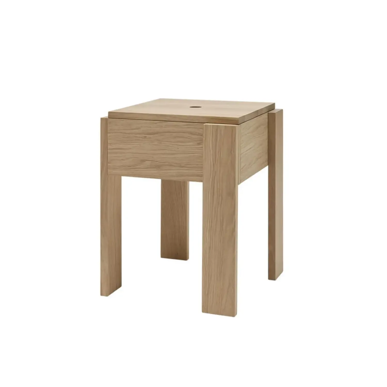 Dette sidebord i massiv egetræ kombinerer holdbarhed med praktisk design. Den naturlige oliebehandling fremhæver træets smukke årer, mens den aftagelige bordplade giver adgang til et skjult opbevaringsrum.