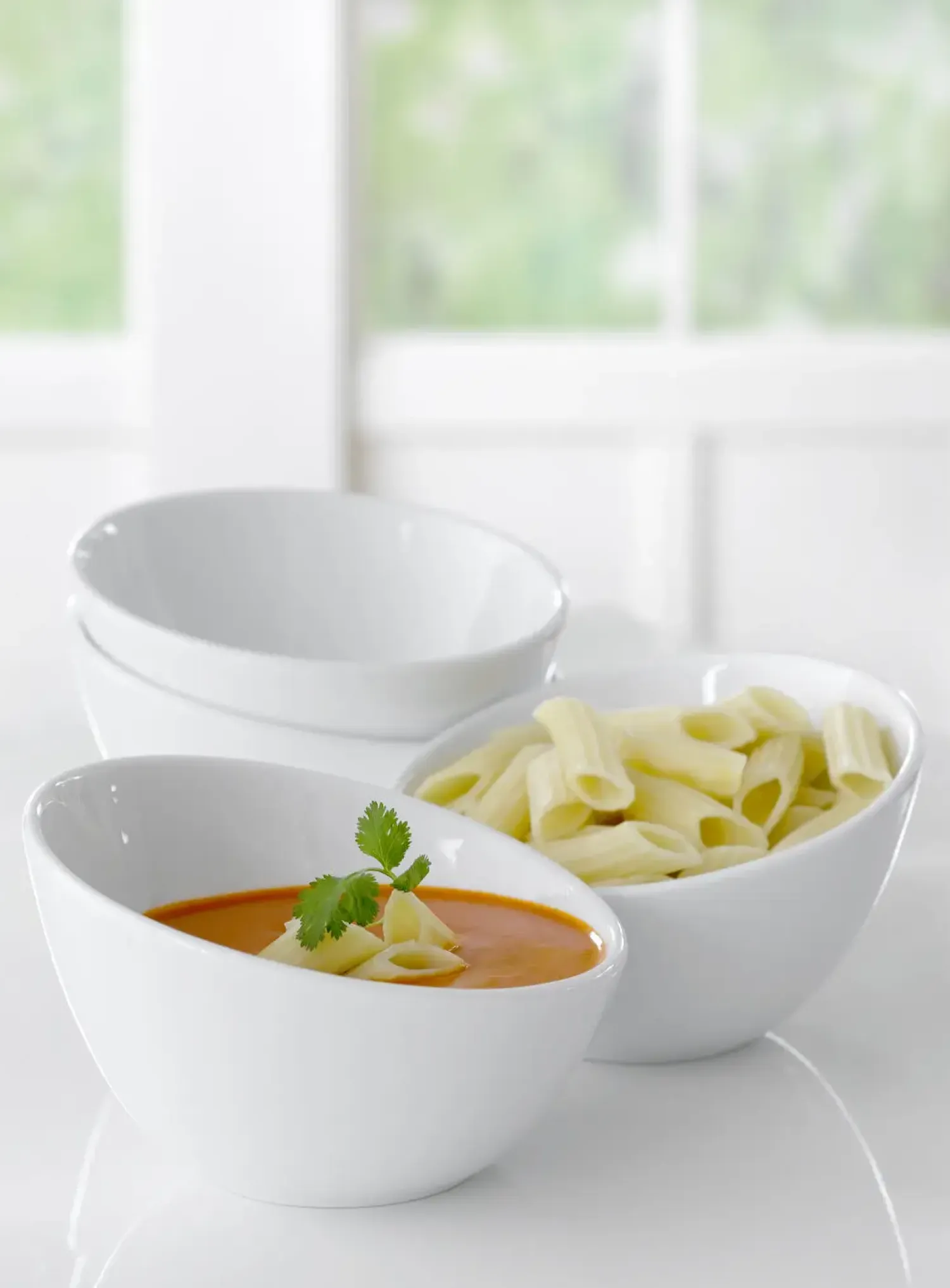 Den asymmetriske form gør skålene særligt velegnede til forskellige serveringsformål. Du kan bruge dem til alt fra snacks og salater til supper og desserter. Den hvide farve passer naturligt ind i enhver borddækning.
