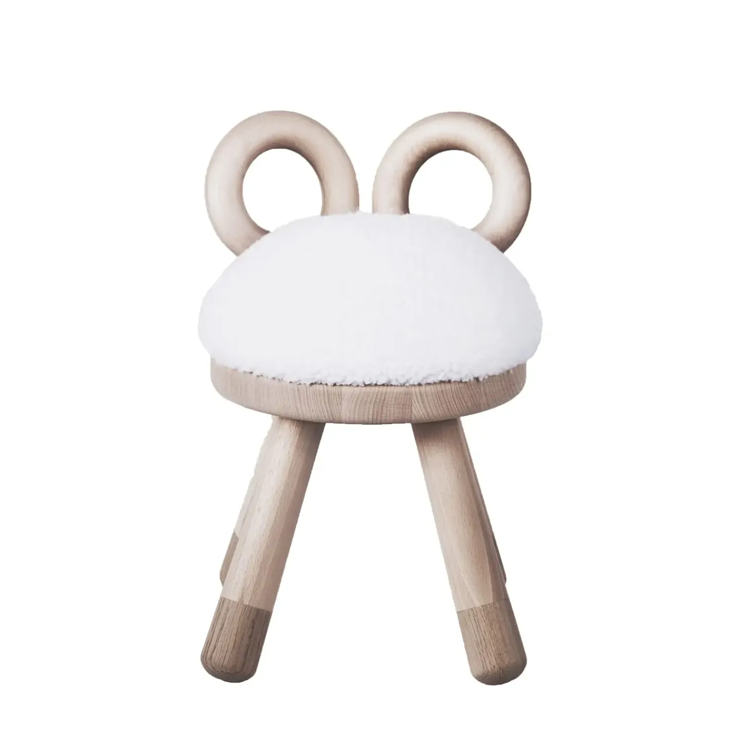 Sædet er betrukket med faux fur, som giver en blød og behagelig siddefornemmelse for børn. Det faux fur materiale er ikke kun komfortabelt, men også let at rengøre, hvilket gør det praktisk for forældre. Den realistiske tekstur tilføjer en ekstra dimension til det charmerende fåredesign.