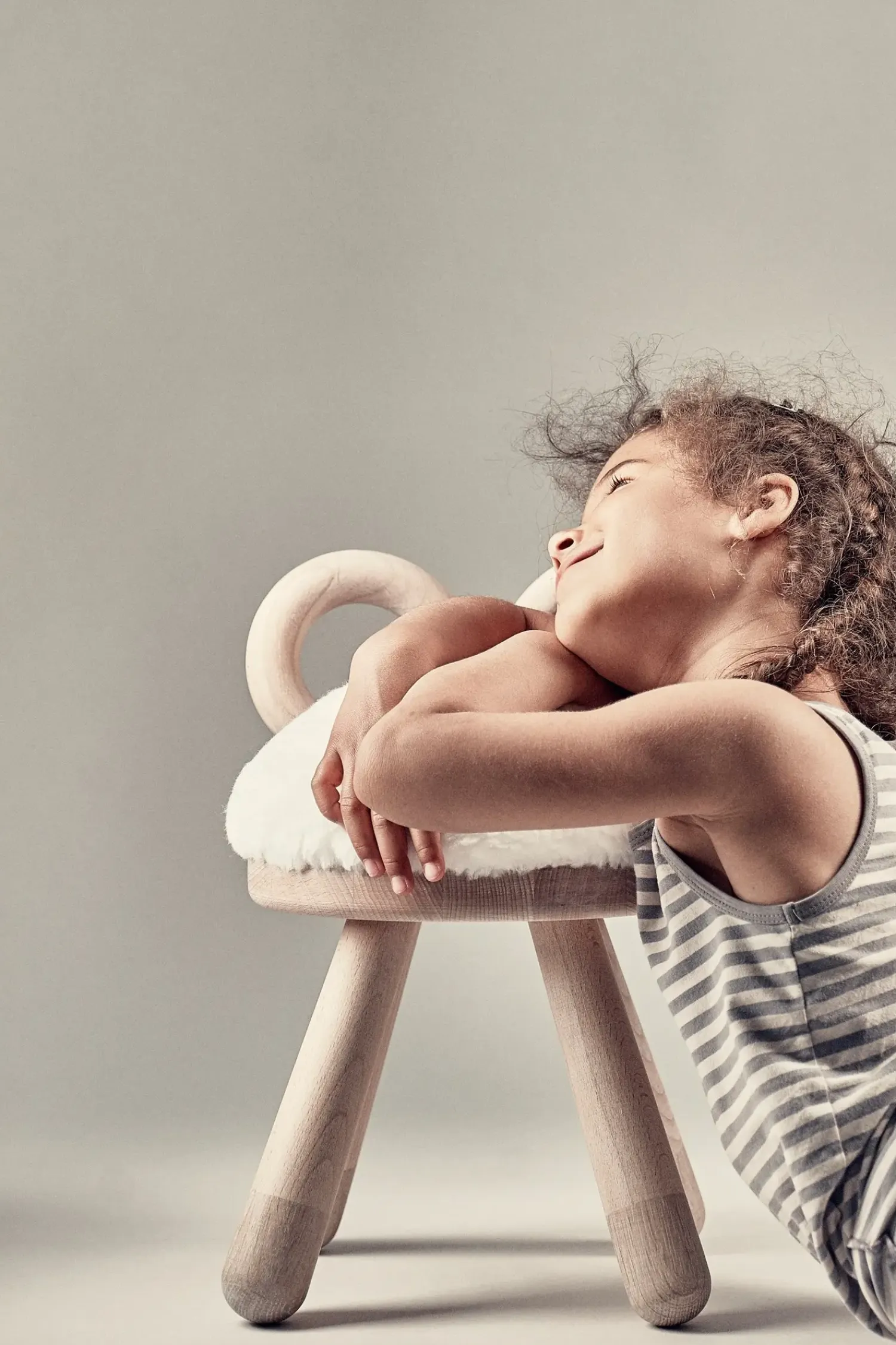 EO Play skammel – får er en charmerende børnestol designet af Takeshi Sawada. Den er skabt som en skulptur med klare referencer til fårets karakteristika. Stolen passer ideelt ind på børneværelset, hvor børn kan lade fantasien få frit løb og nyde hyggelige øjeblikke med de andre bondegårdsdyr.