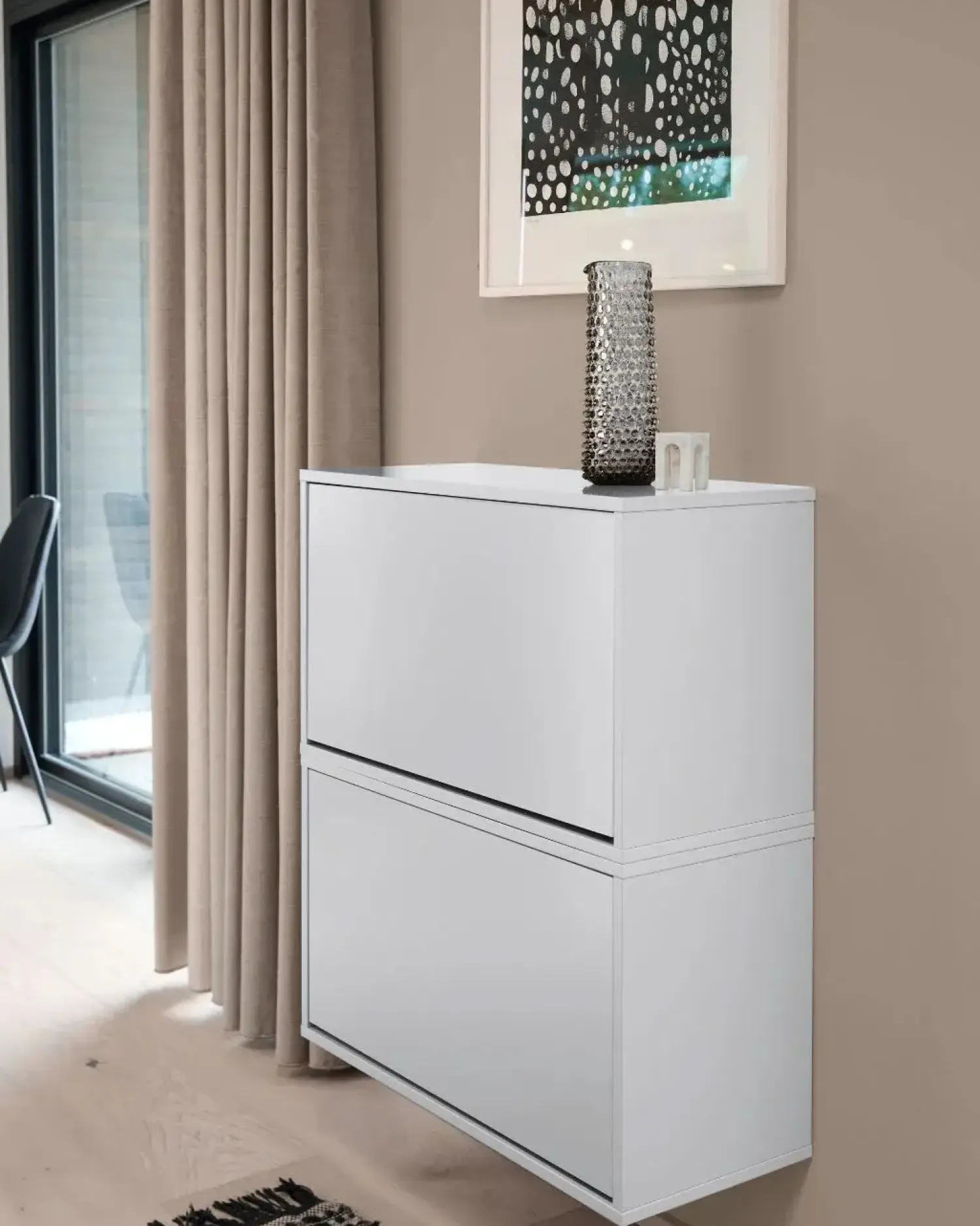 Den væghængte montering frigør gulvplads og gør rengøringen lettere. Du kan nemt tilpasse skoboksene efter behov – stable dem, placere dem side om side eller kombinere dem med andre bokse i samme design og farvepalet for at skabe en personlig og harmonisk opbevaringsvæg. Skoboksen åbnes nemt med en tryklås, så du hurtigt kan få fat i dine sko. Den leveres færdigsamlet og er bygget til at holde, så du kan opbevare dine sko sikkert og pænt. Toppladen kan desuden bruges til pynt eller ekstra opbevaring.