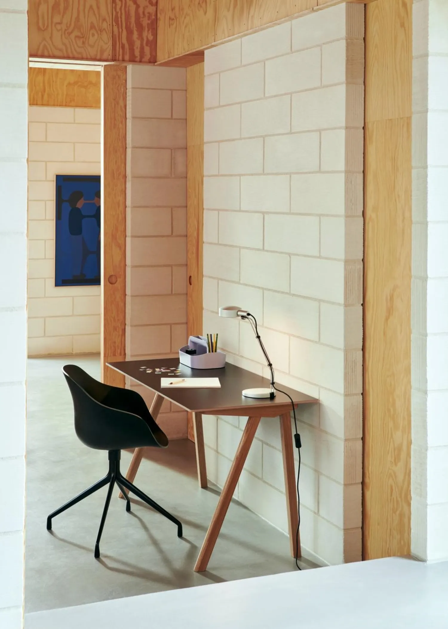 Dette skrivebord fra Hay er fremstillet i eg med sort vandbaseret lak. Overfladen er holdbar og giver dig et solidt arbejdsområde, der holder sig pænt i lang tid. Lakken fremhæver træets naturlige struktur.