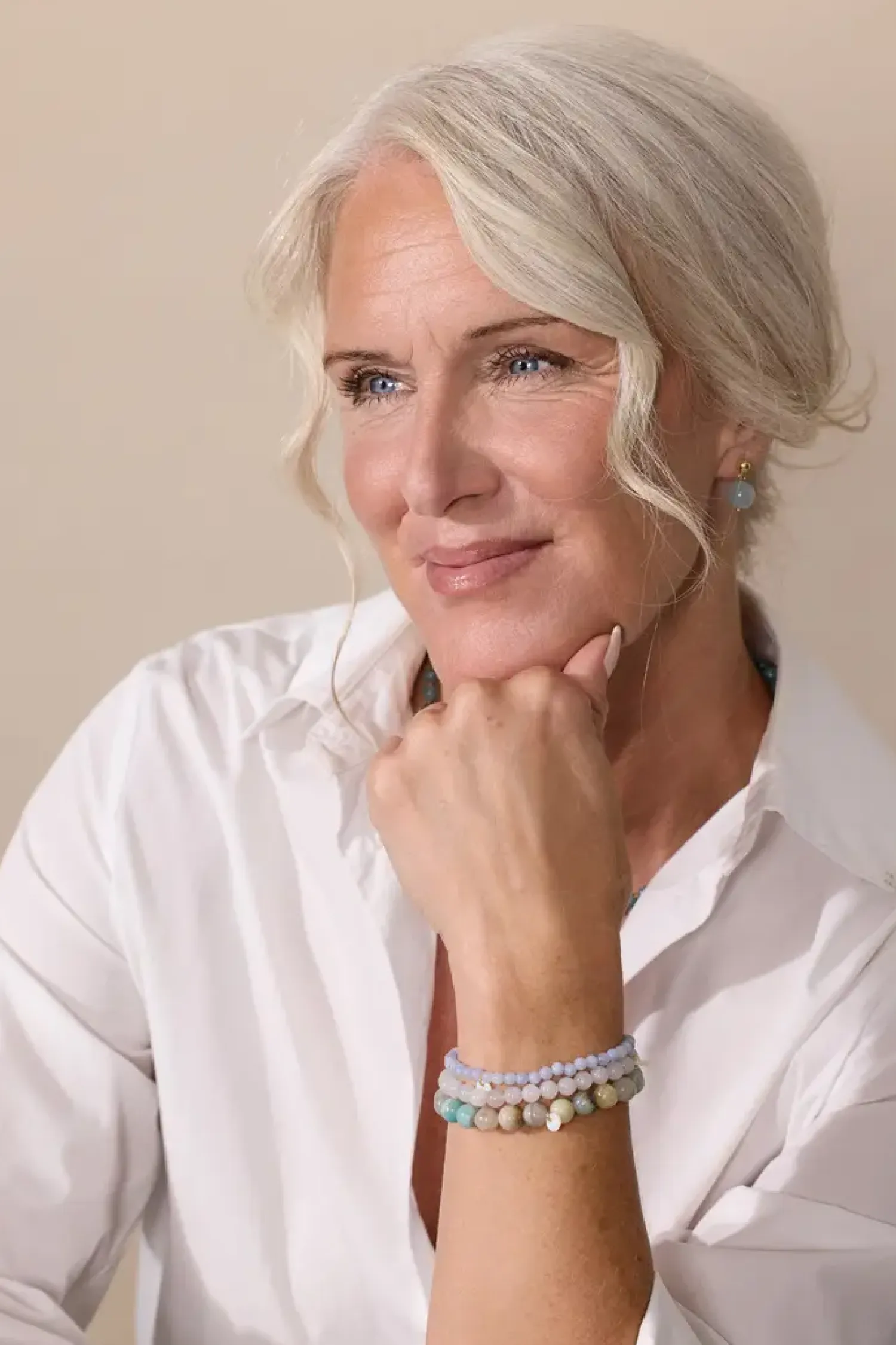 De blå toner fra aquamarin står for klarhed og indre ro. Håndlavet med omhu og finesse, er armbåndet mere end et smykke; det er et symbol på balance og positivitet.