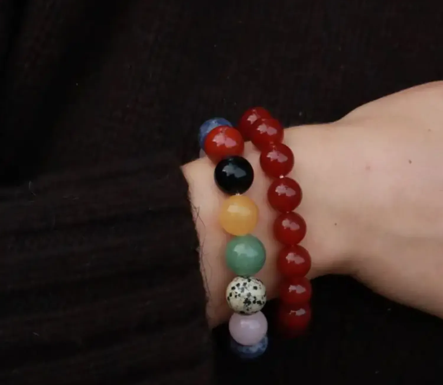 Farver og mønstre kan variere, da hver sten er naturlig og særpræget. Dette betyder, at dit armbånd får sit eget udtryk. Kombinationen af grøn aventurin, dalmatian jasper, rosenkvarts, blue point, rød jasper, black onyx og honey jade skaber en farverig palette, der passer til kreative individer.