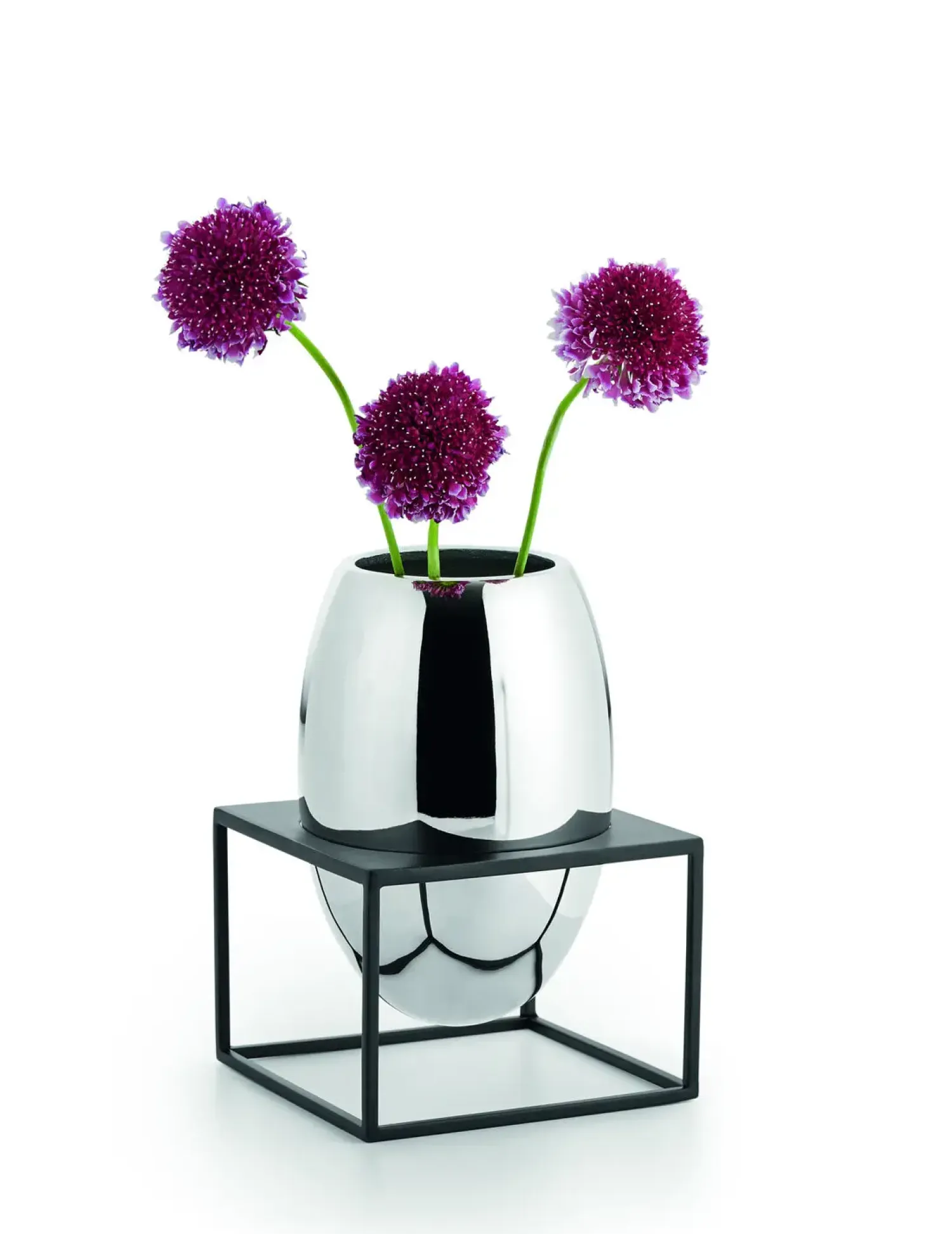 Philippi Solero vase med stativ er designet af Mike Ruch og kombinerer moderne æstetik med funktionalitet. Vasen har et skinnende, sølvfarvet ydre og et sort indre, der fremhæver dens sfæriske form. Den kubiske, sorte stand giver stabilitet og et elegant udseende.