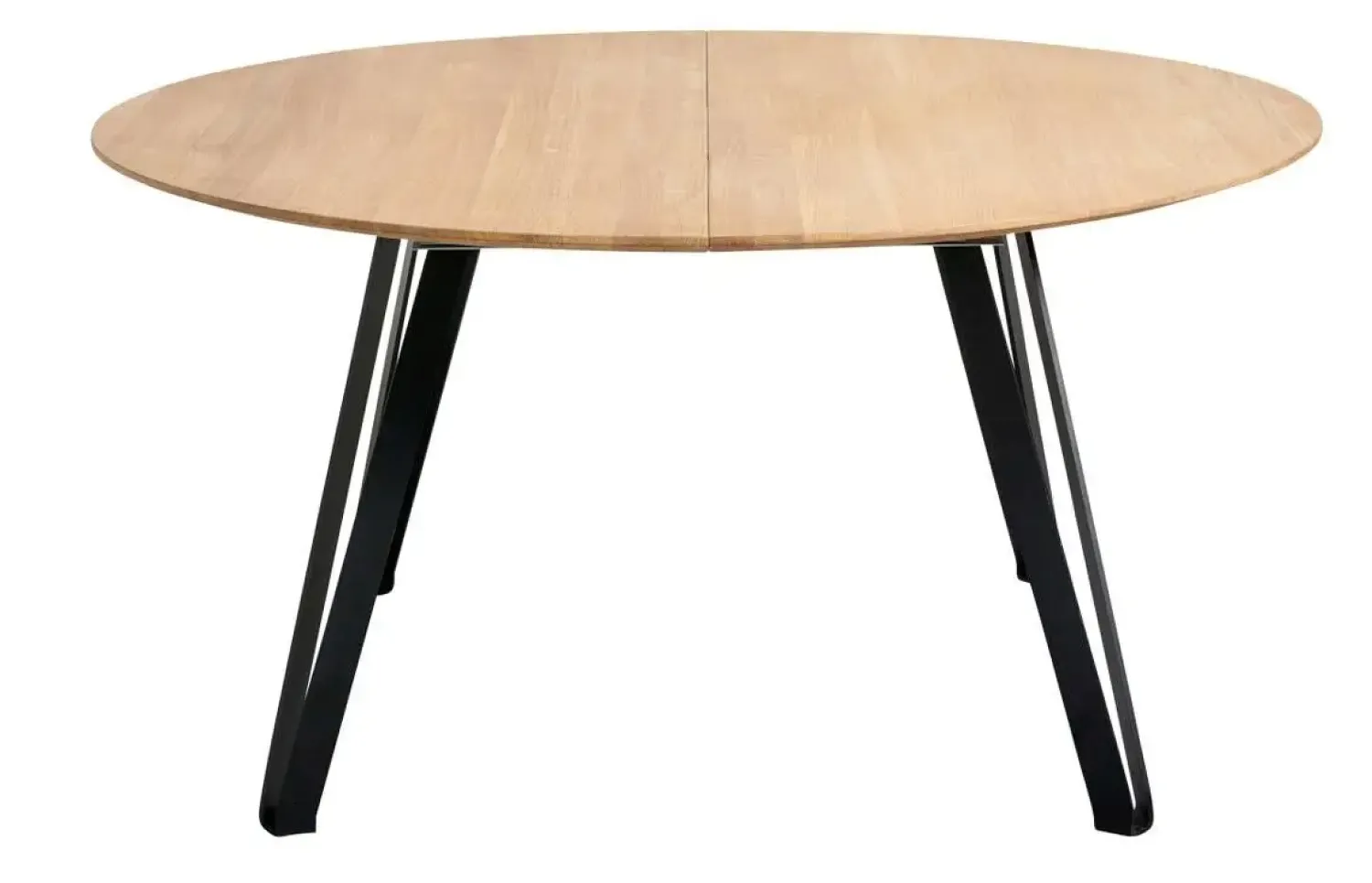 Space spisebordet tilbyder en praktisk løsning til forskellige behov. Den runde form giver mulighed for nem samtale mellem gæsterne, mens den valgfri tillægsplade gør det muligt at udvide bordet efter behov. De sorte, vinklede metalben giver stabil støtte og komplementerer det naturlige egetræ.