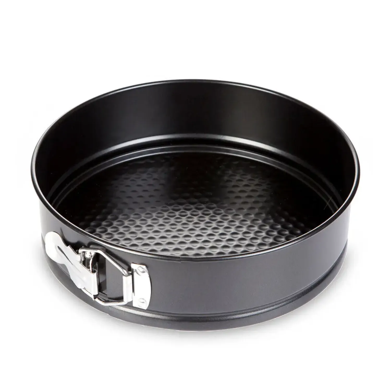 Denne springform i stål med non-stick belægning gør hjemmebagning nemmere. Den mønstrede bund sikrer jævn varmefordeling, mens den 24 cm store form rummer 2,7 liter.