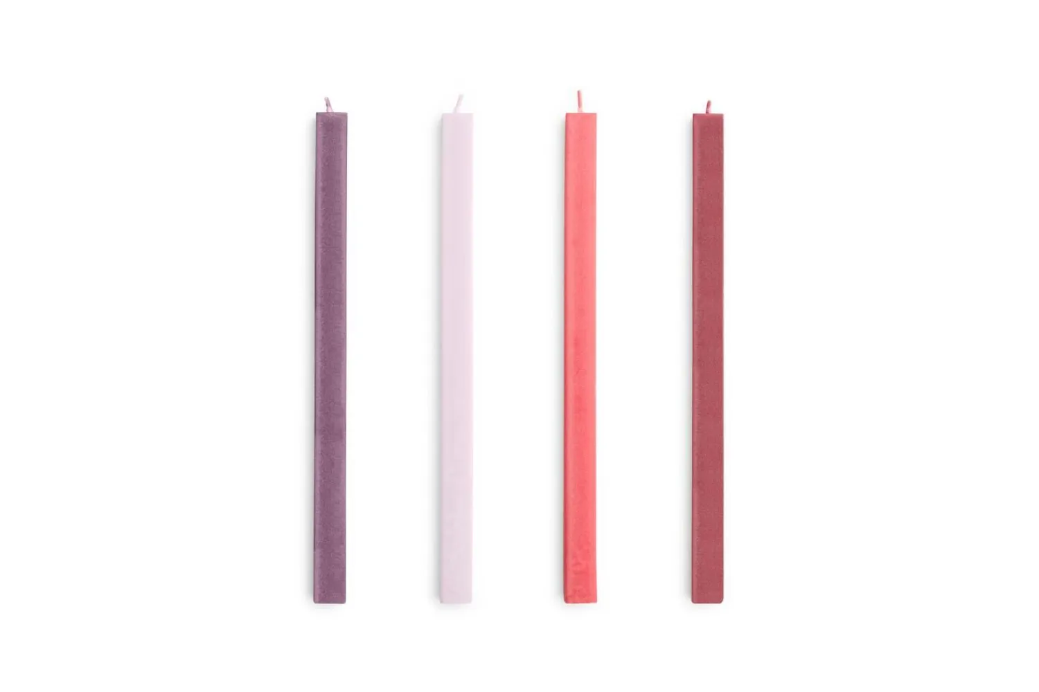 Fire slanke stearinlys i et moderne, firkantet design med en højde på 24 cm. Sættet kommer i harmoniske nuancer af bordeaux, lilla, lyserød og rød, der giver dig mulighed for at skabe din egen stemningsfulde bordpynt.