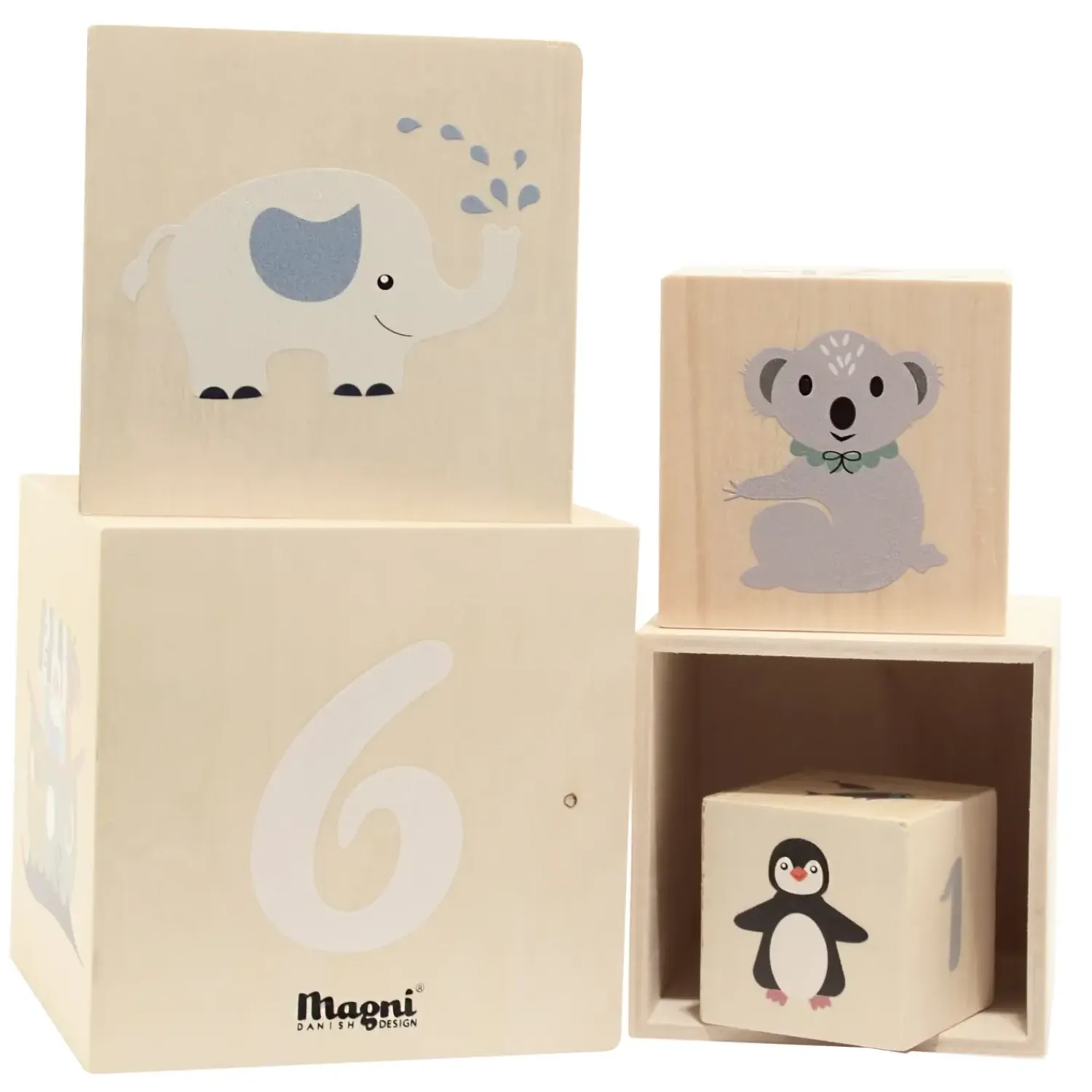 Magni stablekasser i træ er dekoreret med tal, dyr og sjove figurer, der stimulerer barnets nysgerrighed og fantasi. Når barnet stabler kasserne, styrkes både koordinationsevnen og finmotorikken. En lærerig og underholdende leg, hvor man kan øve talgenkendelse, lære om dyr og udforske mange spændende muligheder.