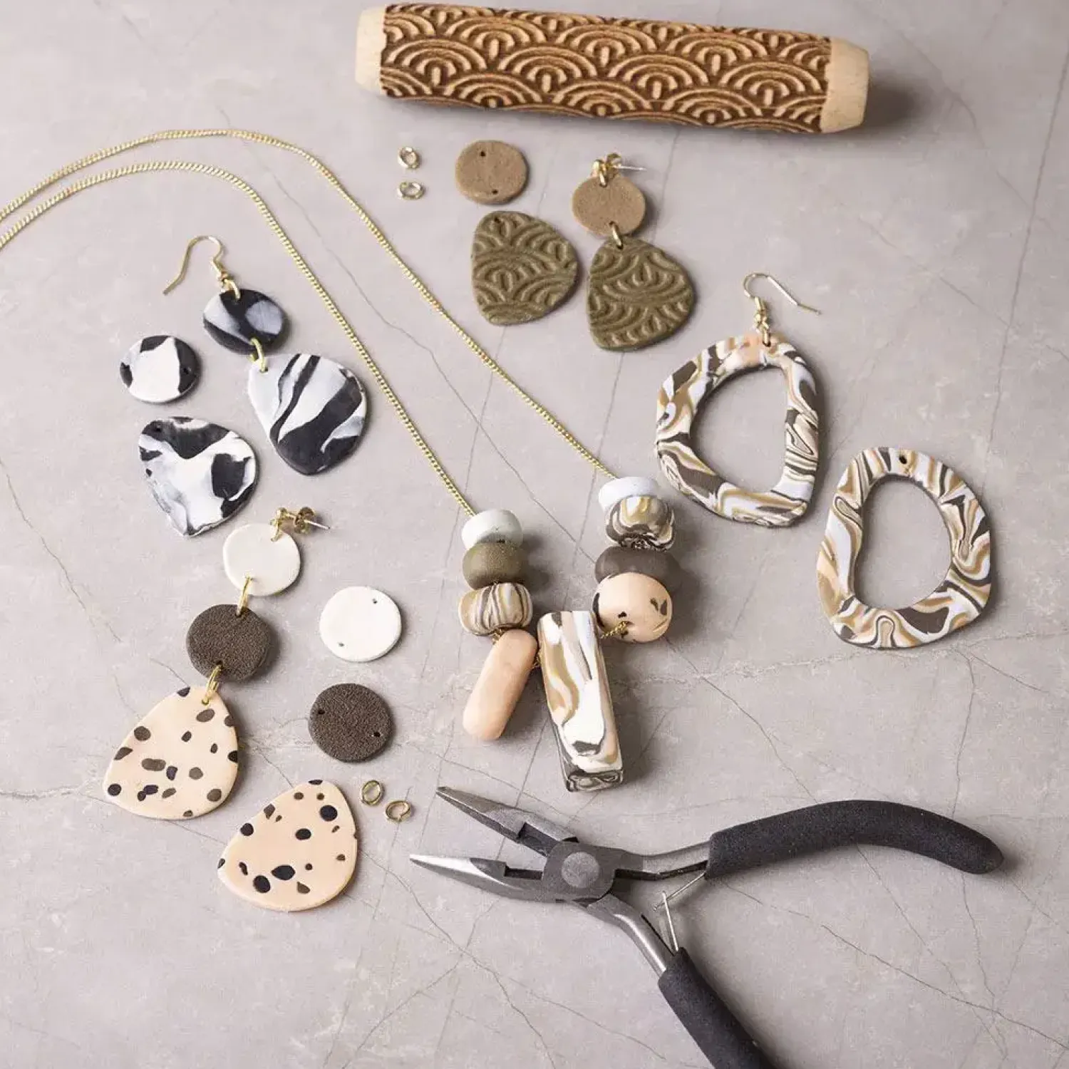 Med dette kit kan du lære at lave unikke smykker med det bløde og smidige ler, Fine clay polymer. Indeholder alle de materialer du skal bruge, og al den vejledning du behøver.Vil du lære at lave smykker af ler, er vores Start DIY Kit perfekt. Det indeholder alt, hvad du skal bruge for at komme godt i gang. Scanner du QR-koden på æsken, bliver du ført direkte ind i vores læringsunivers. Her kan du se videoer, som guider dig igennem de grundlæggende teknikker – og resultatet bliver de fineste sæt af trendy øreringe og en cool halskæde.Indhold: Smykkeler, udstikker, udruller, mønsterrulle, Modelleringsværktøj- nål, knivblad til ler, sandpapir, smykketang, ørekrog, ørestikker, o-ring, halskæde.