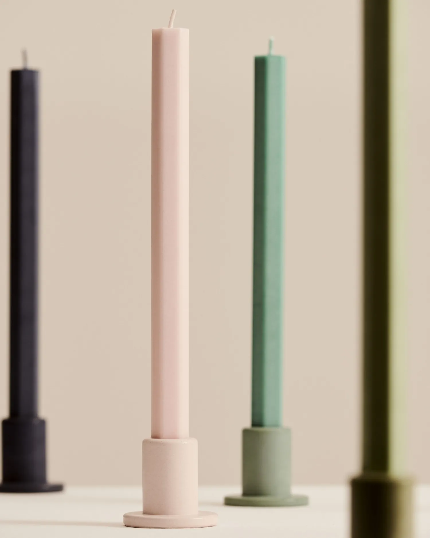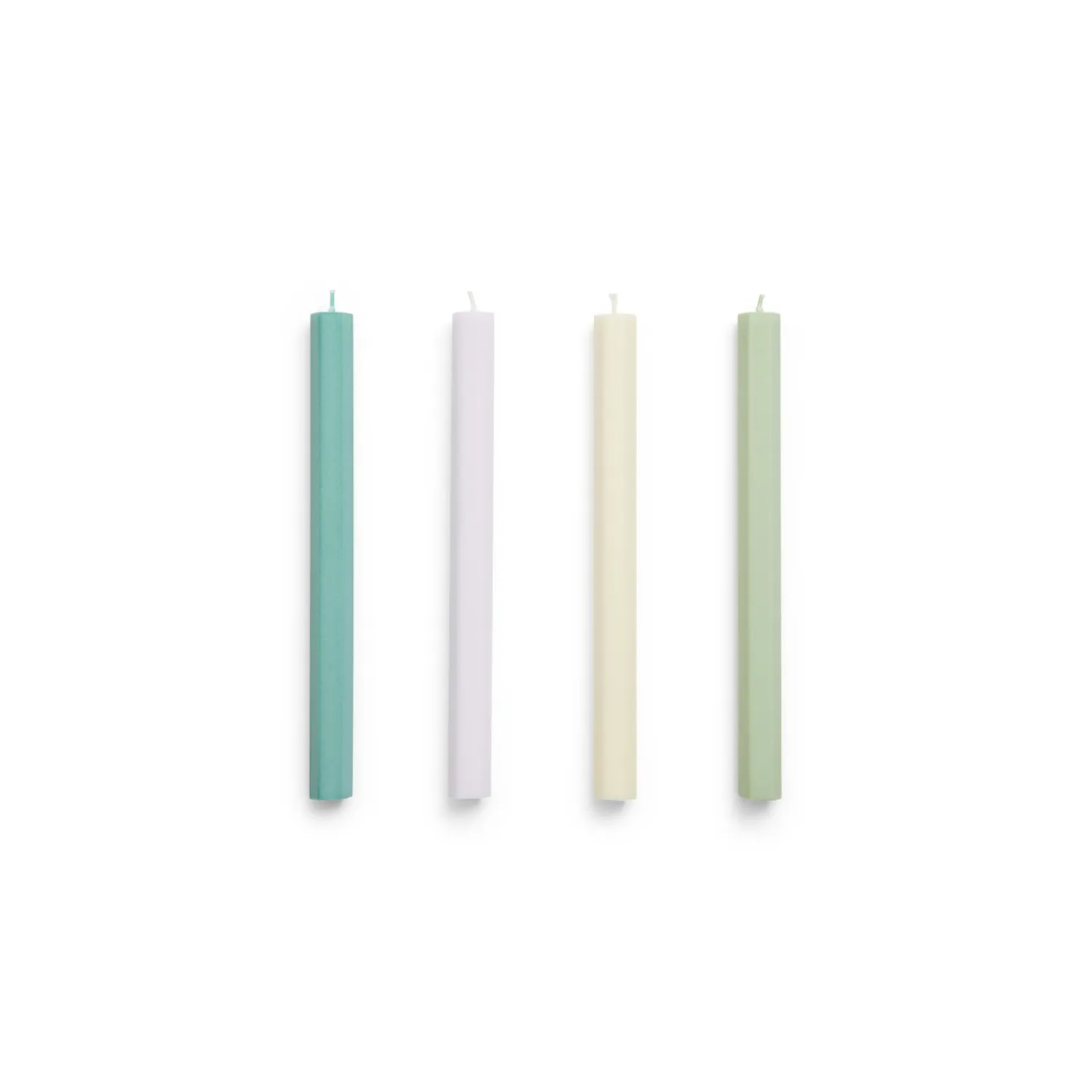 Fire sekskantede stearinlys i forskellige pastelfarver med mat finish. Den geometriske form og de bløde farver giver dig mulighed for at style lysene individuelt eller samlet. Lysene er fremstillet af kvalitetsmaterialer for en jævn og ren forbrænding.