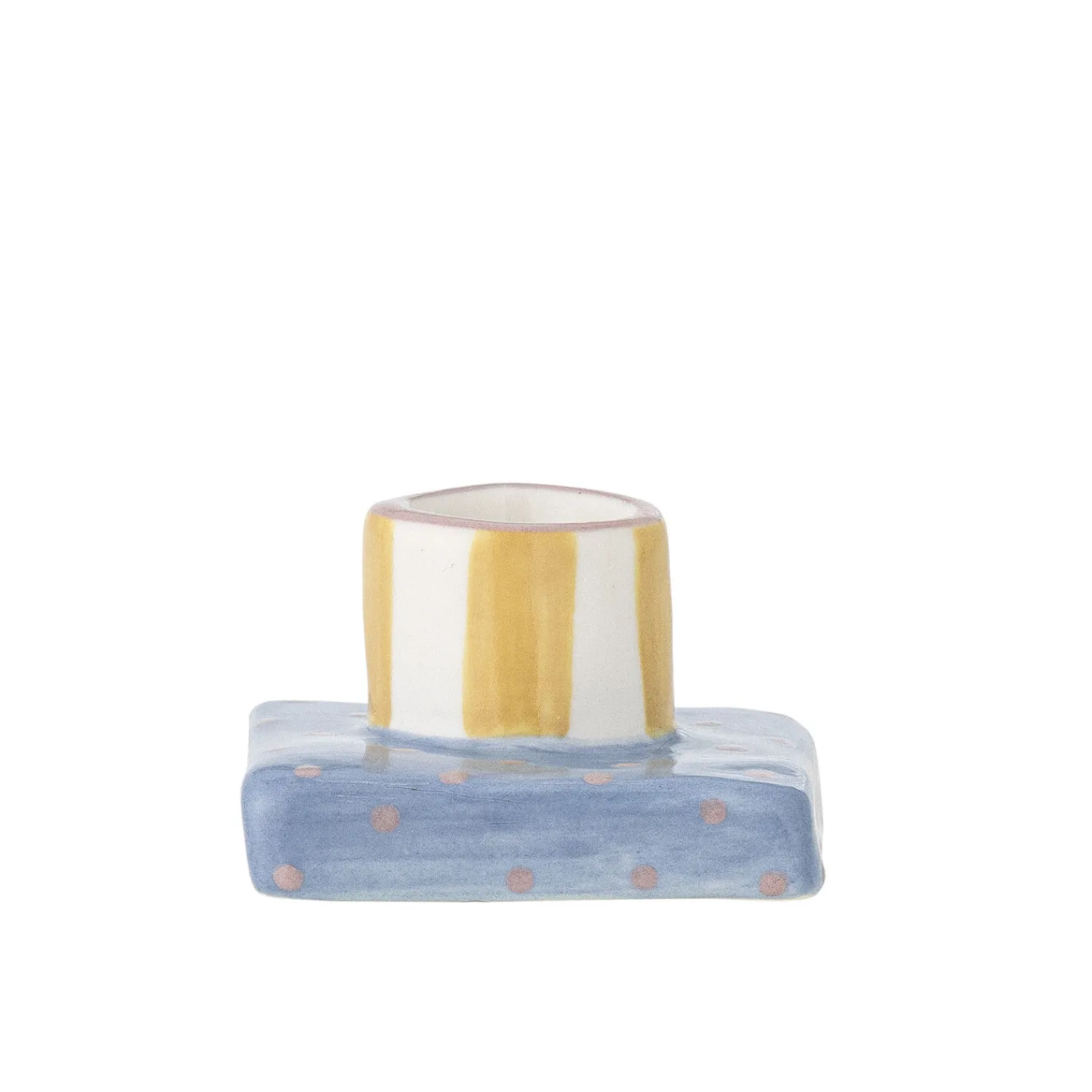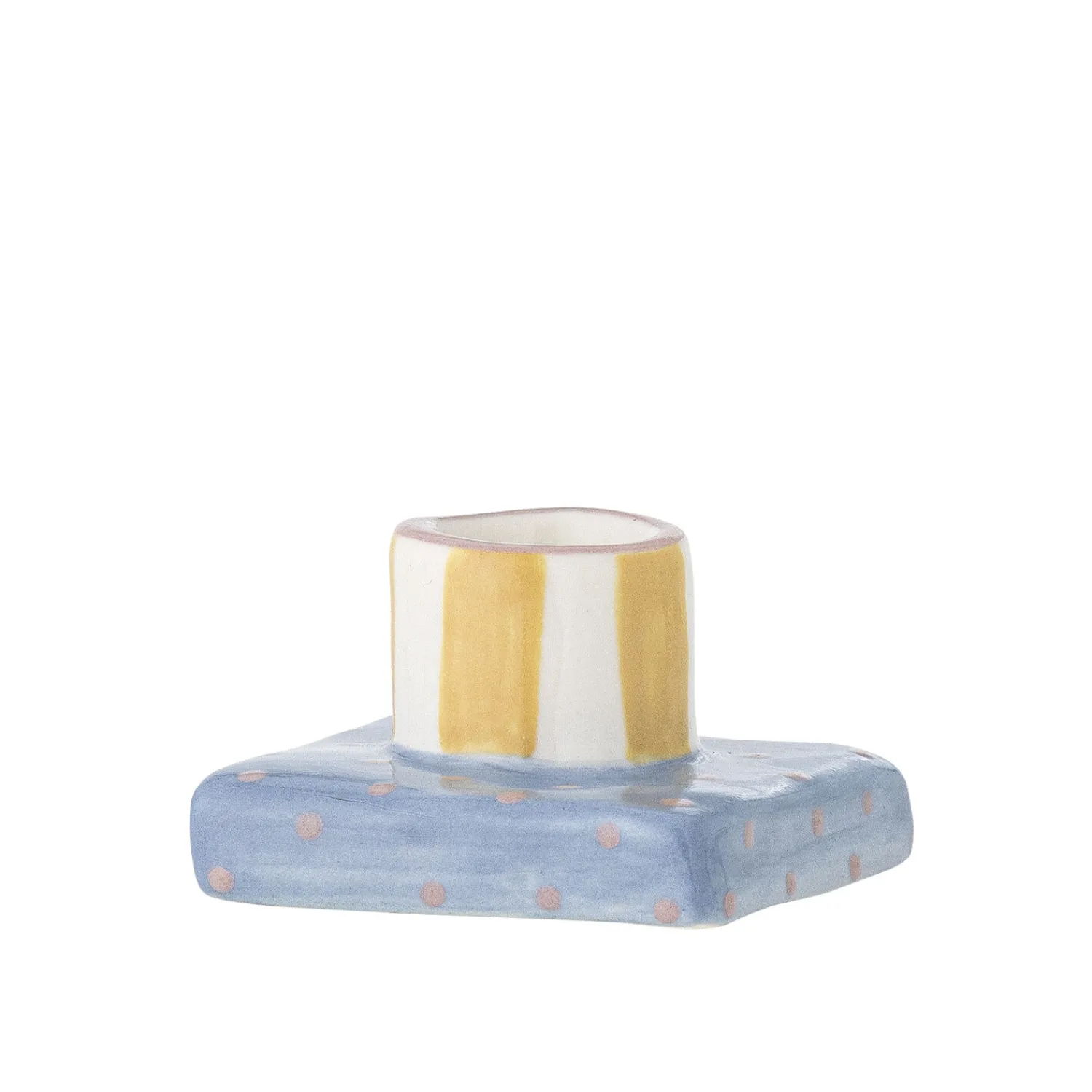Denne lysestage fra Bloomingville er fremstillet i stentøj med glasur. Den har en cylindrisk form med firkantet base og et prikket mønster i blå nuancer med gule og hvide detaljer. Lysestagen er hånddekoreret, hvilket giver hver enkelt et individuelt præg.