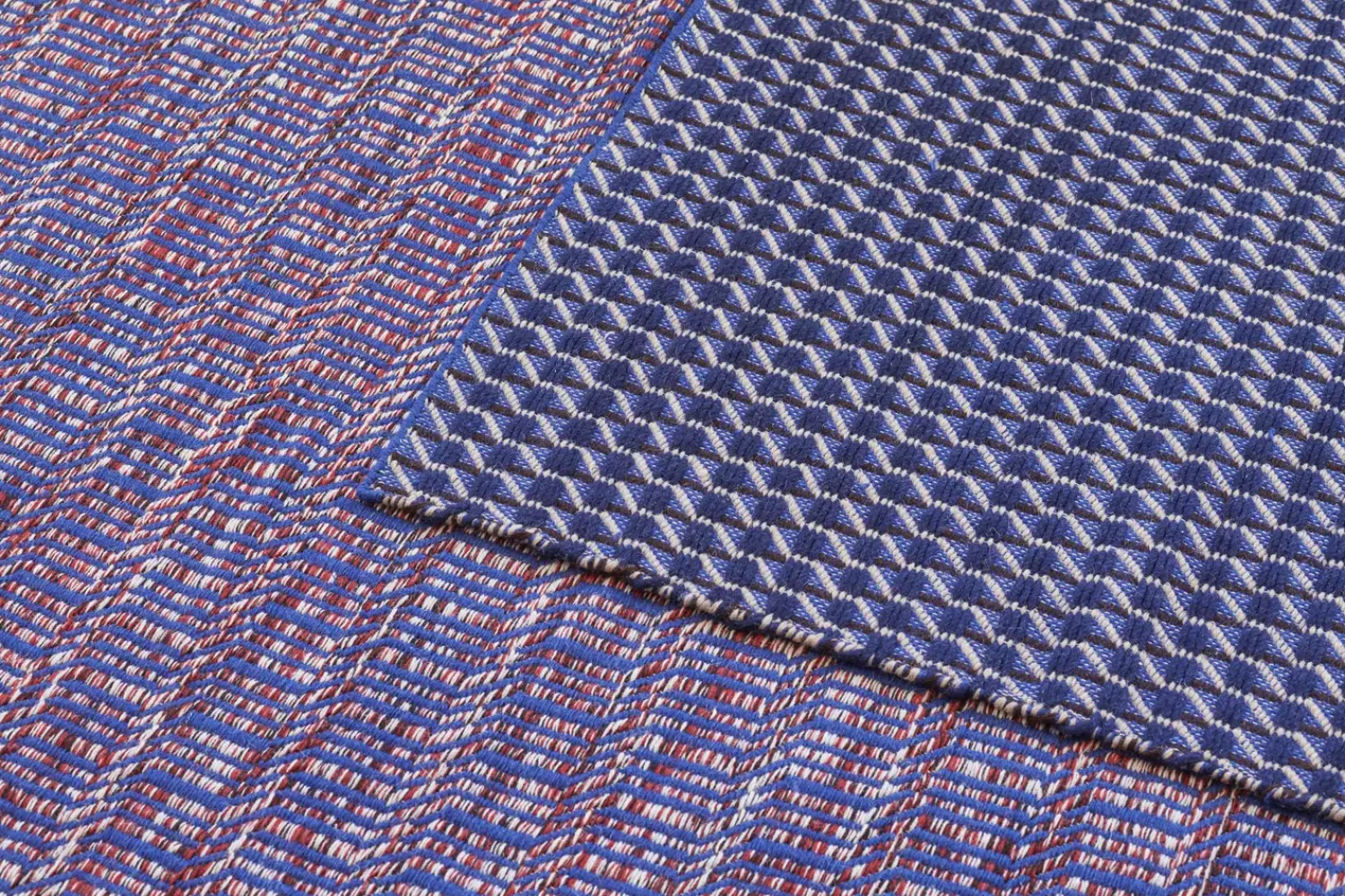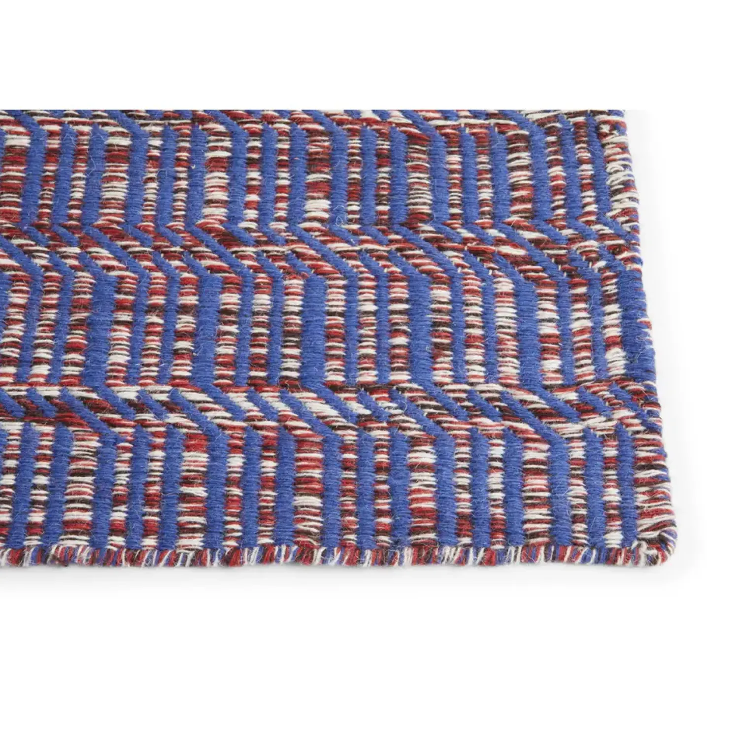 Det røde og blå herringbone-mønster skaber et karakteristisk udtryk. Tæppets håndvævede struktur giver dybde, og farverne gør det nemt at integrere i forskellige indretninger. Hvis du søger et holdbart og stilrent tæppe, er dette et godt valg.