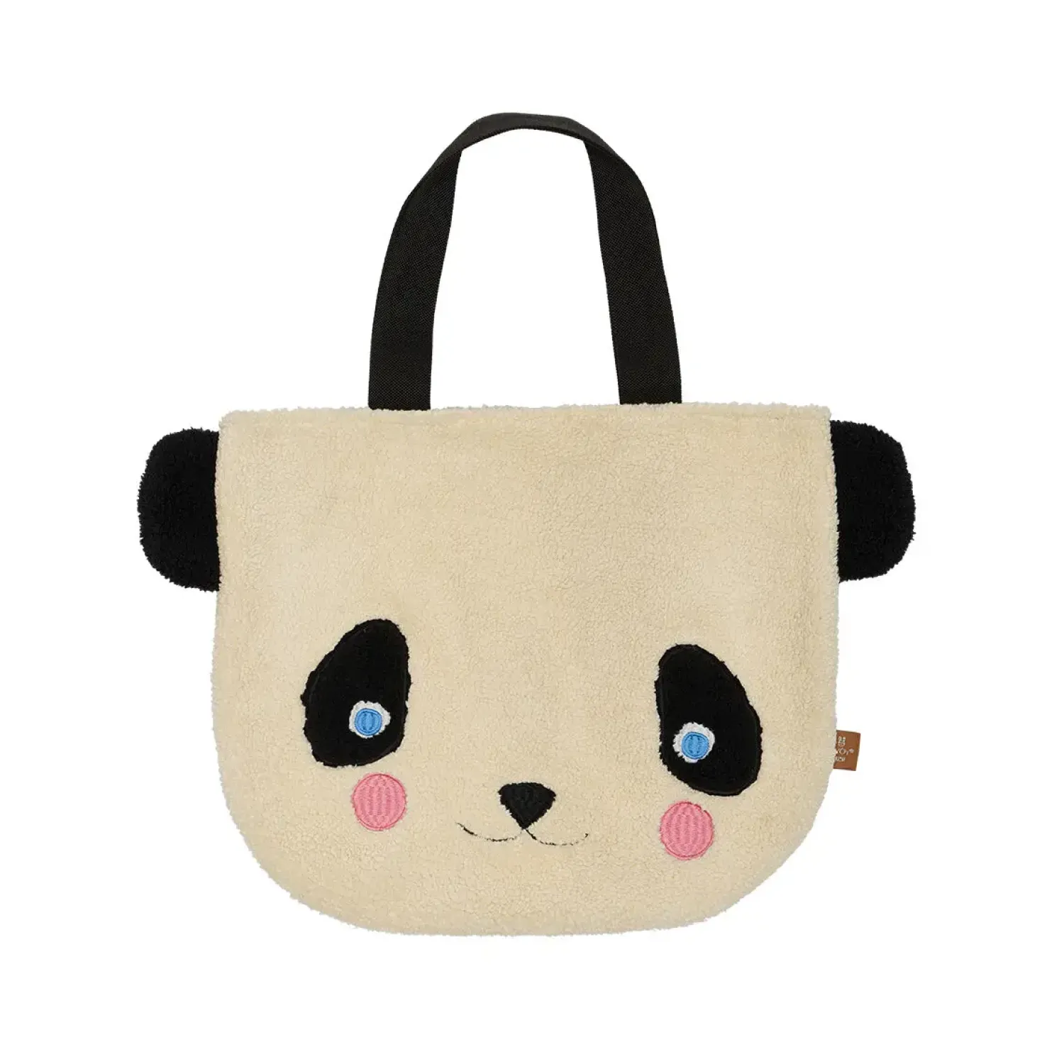 Det broderede pandamotiv med de karakteristiske blå øjne og pink kinder tilfører tasken personlighed. Du får en taske, der både fungerer som en praktisk følgesvend og et sjovt indslag i din hverdag.