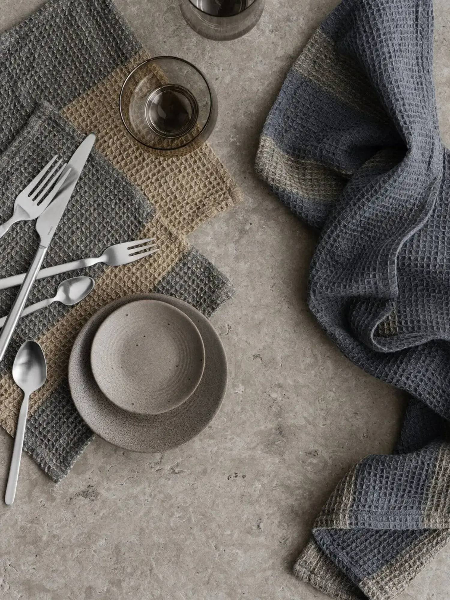 PRAKTISK OG ÆSTETISK – GANO VISTEKLUSTER OG KARAKLUDE GANO viskestykker og karklude, der består af to mønstre pr. sæt, fås i fire forskellige farvekombinationer. Blok- og stribedesignet skabt af Frederike Martens løsnes op af den forvaskede, fine vaffelpiké. Den tredimensionelle struktur af den økologiske bomuld skaber en stor, absorberende overflade, denne er luftgennemtrængelig og tørrer derfor hurtigt.