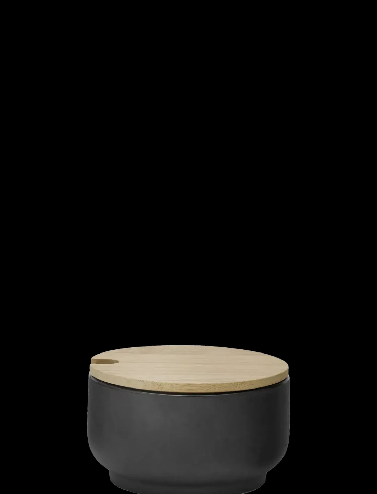 Sukkerskålen fra Theo-serien er beroligende for øjet og sindet og er med dens smukke kontraster skabt til at vække sanserne. Sukkerskålen er formet i mat sort stentøj med en blank glasering, der gør den både rustik og elegant. Skålen kommer med et bambuslåg, med plads til ske, som beskytter sukkeret.