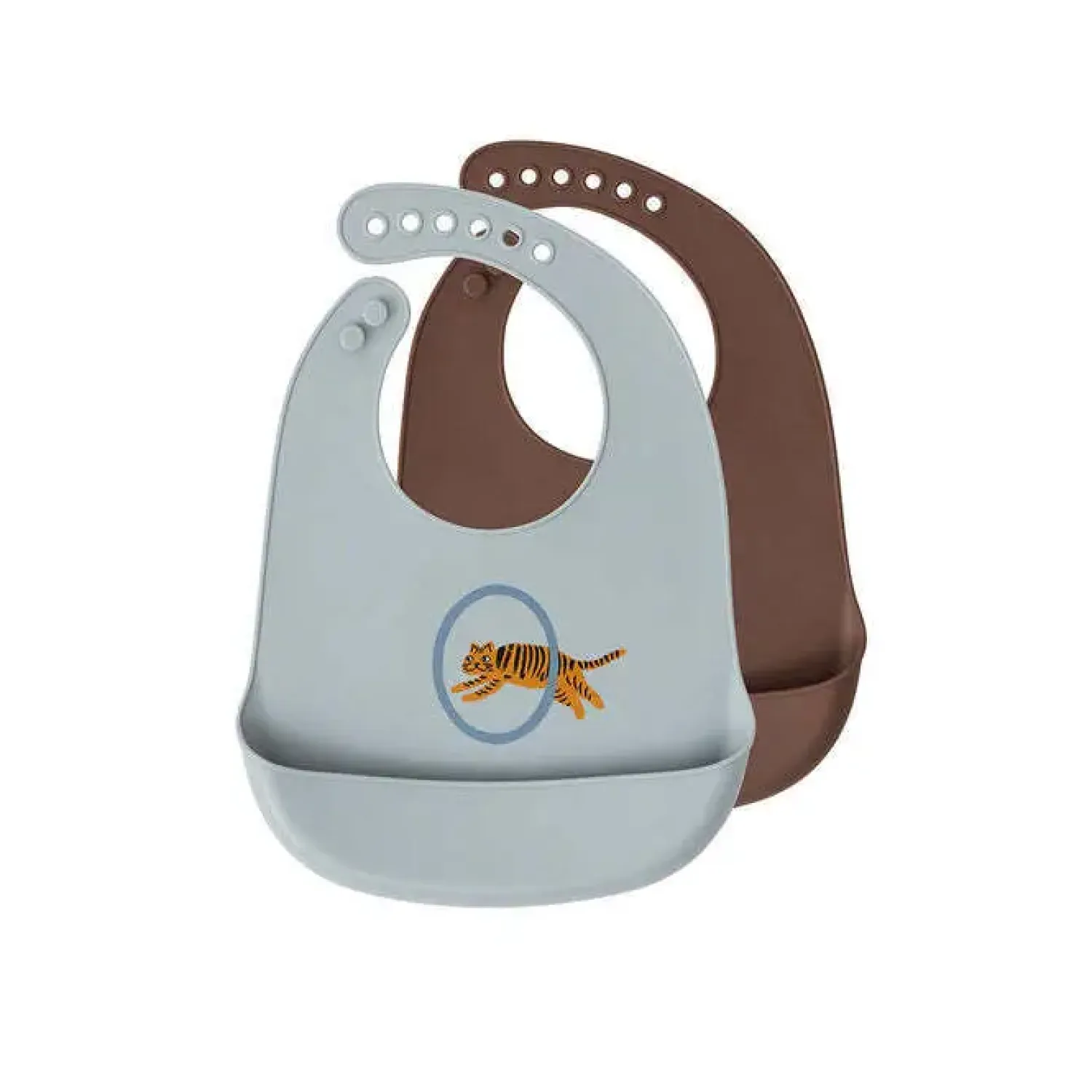 En hagesmæk i silikone, med en praktisk lukning i nakken. Hagesmækken kan samle mad og væske, så det ikke ryger på tøjet. Hagesmækken er lavet med en sød illustration af en tiger – Kendetegnende for mange OYOY design til børn.Hagesmækkene er lavet af 100% silikone, printet. Sæt af 2 stk.Til rengøring, anbefales det at vaske i varmt sæbevand.