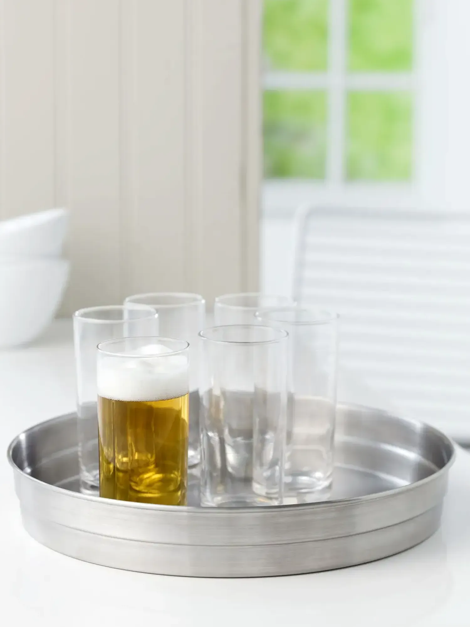 Denne rustfrie stålbakke med en diameter på 32 centimeter giver dig god plads til servering af flere glas eller tallerkener på én gang. Den stabelbare kant gør det nemt at stable flere bakker oven på hinanden.