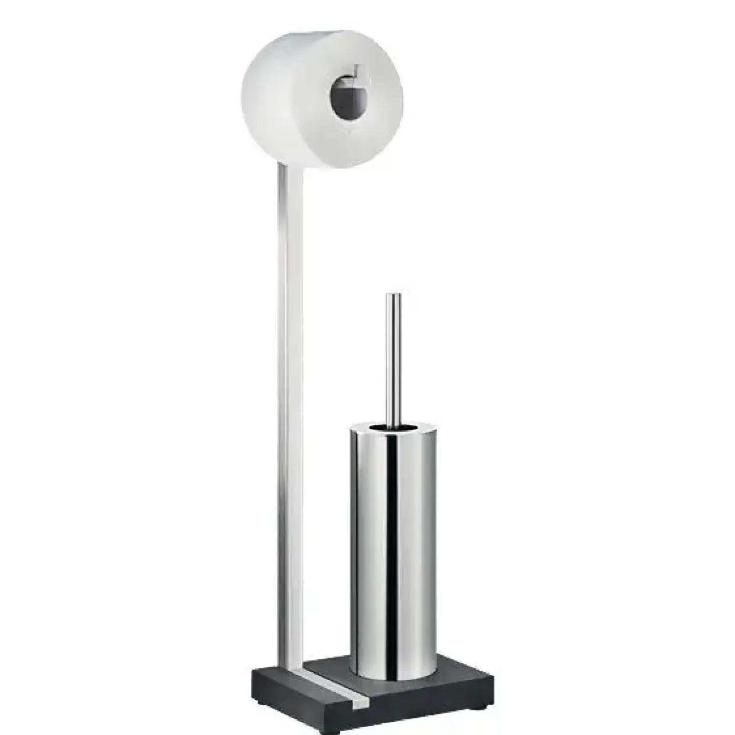 MENOTO toiletbutler holder dit toiletpapir og toiletbørste inden for hver rækkevidde til enhver tid og kan placeres hvor som helst i dit badeværelse. Den dygtige kombination af den varme, mørke kunstige sten med den kølige elegance af mat rustfrit stål giver modellen sit raffinerede look. Rustfrit stål og kunstig sten ser ud til at smelte sammen i basens attraktive design. Selvom børsteholderen virker lukket, ventileres børsten gennem lågets design. Den aftagelige stofindsats muliggør nem rengøring.