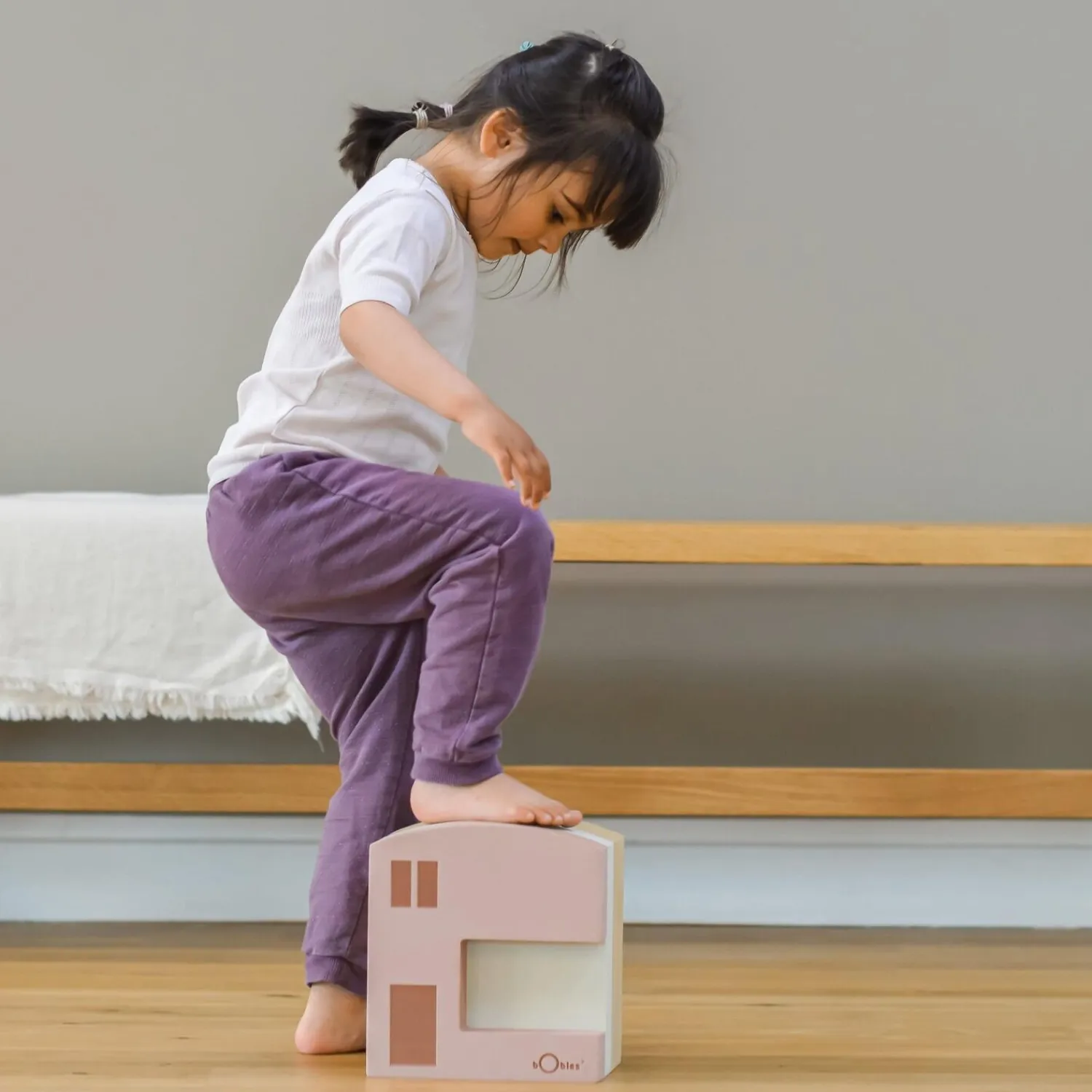 Denne husformede skammel fra bObles kombinerer et praktisk siddemøbel med en legende vippefunktion. Vend den på hovedet, og den bliver til en rocker, der udfordrer balancen. Farverne lyserød og beige med vindues- og dørillustrationer skaber en bygningsinspireret form.