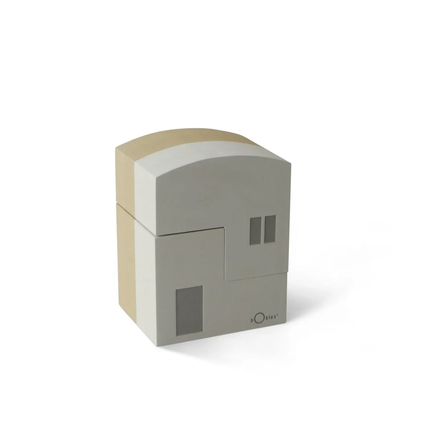Designet inkluderer grafiske elementer, der ligner vinduer og en dør, så dit barn kan lege hus og skabe historier. Den buede top giver produktet en karakteristisk husform. Det flerfarvede materiale gør det visuelt interessant uden at overvælde, og det passer ind i de fleste børneværelser.