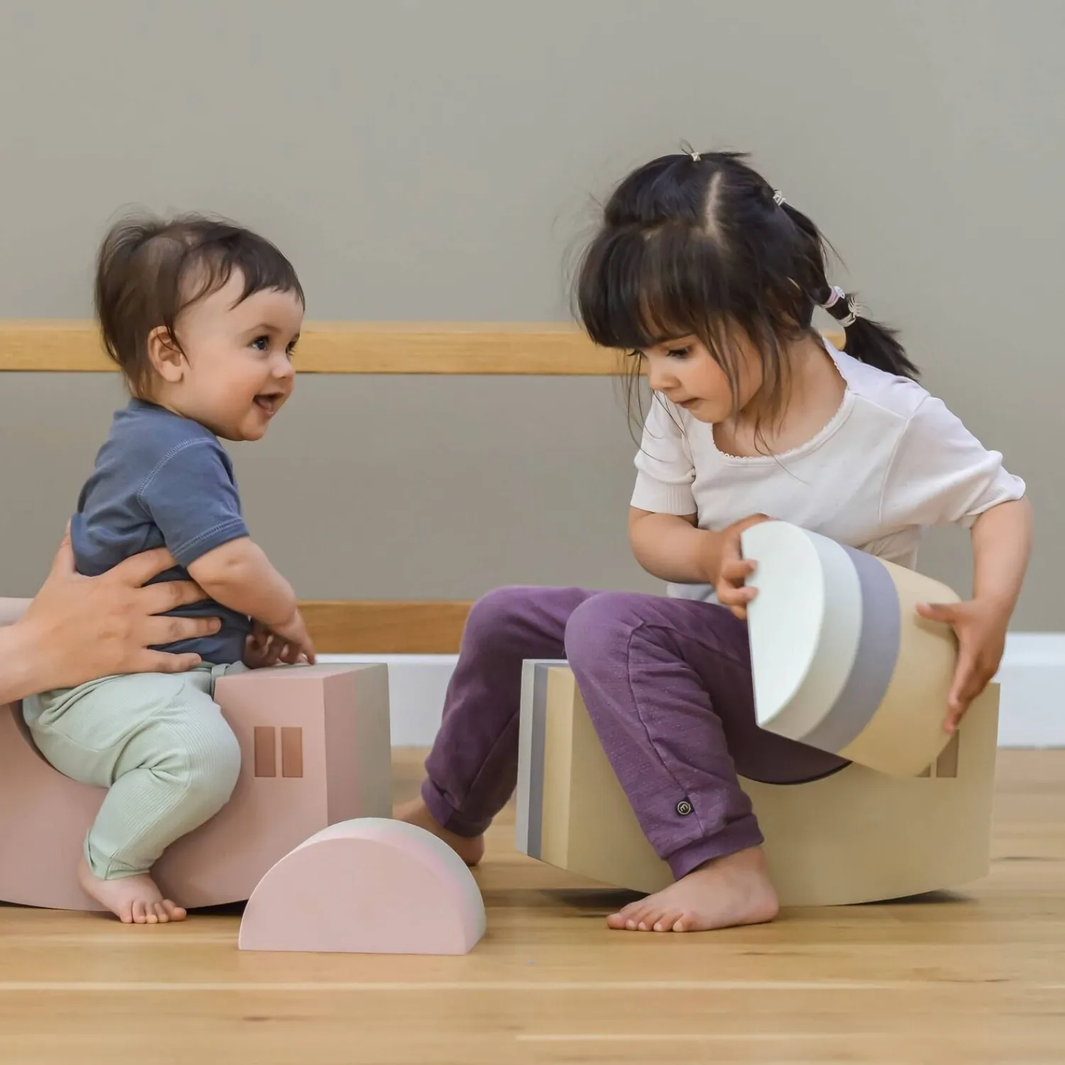 Hvis du søger legetøj, der ikke bare optager plads, er dette sæt relevant for dig. Den større del fungerer som en stabil skammel, når buen vender nedad, eller som en rocker, når den vender opad. Den mindre del kan bruges som trædesten til at nå op til vasken eller som en lille trappe. Begge dele inviterer til kreativ leg og bevægelse.