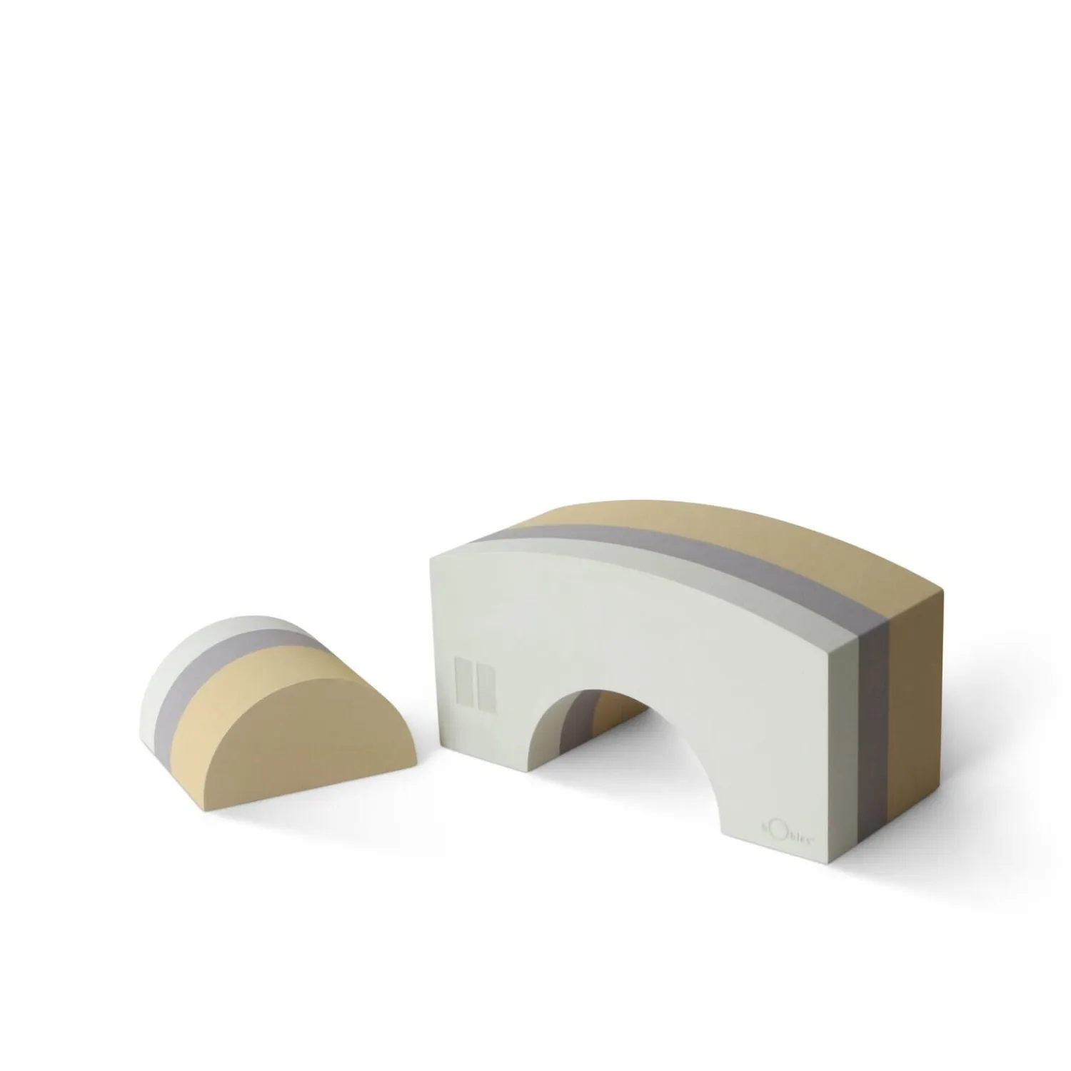 Town House Gate Oslo består af to separate dele: en større bueformet port og en mindre halvcirkelformet del. Materialet er flerfarvet med naturlige lag af beige og grå, som giver en rolig æstetik i legemiljøet. Produktet kan bruges som skammel eller vippe, hvilket giver alsidig anvendelse i børns hverdag.