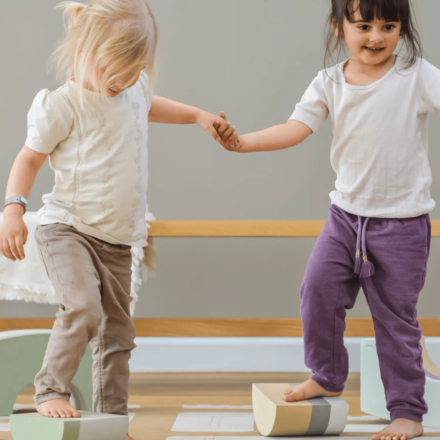 Begge dele kan bruges som trædesten, hvilket hjælper børn med at træne balance og koordination. De flerfarvede lag af beige og grå skaber visuel interesse uden at overstimulere. Konstruktionen er designet til at understøtte kreativ leg, hvor børn selv bestemmer, hvordan delene skal bruges i deres fantasiverden.