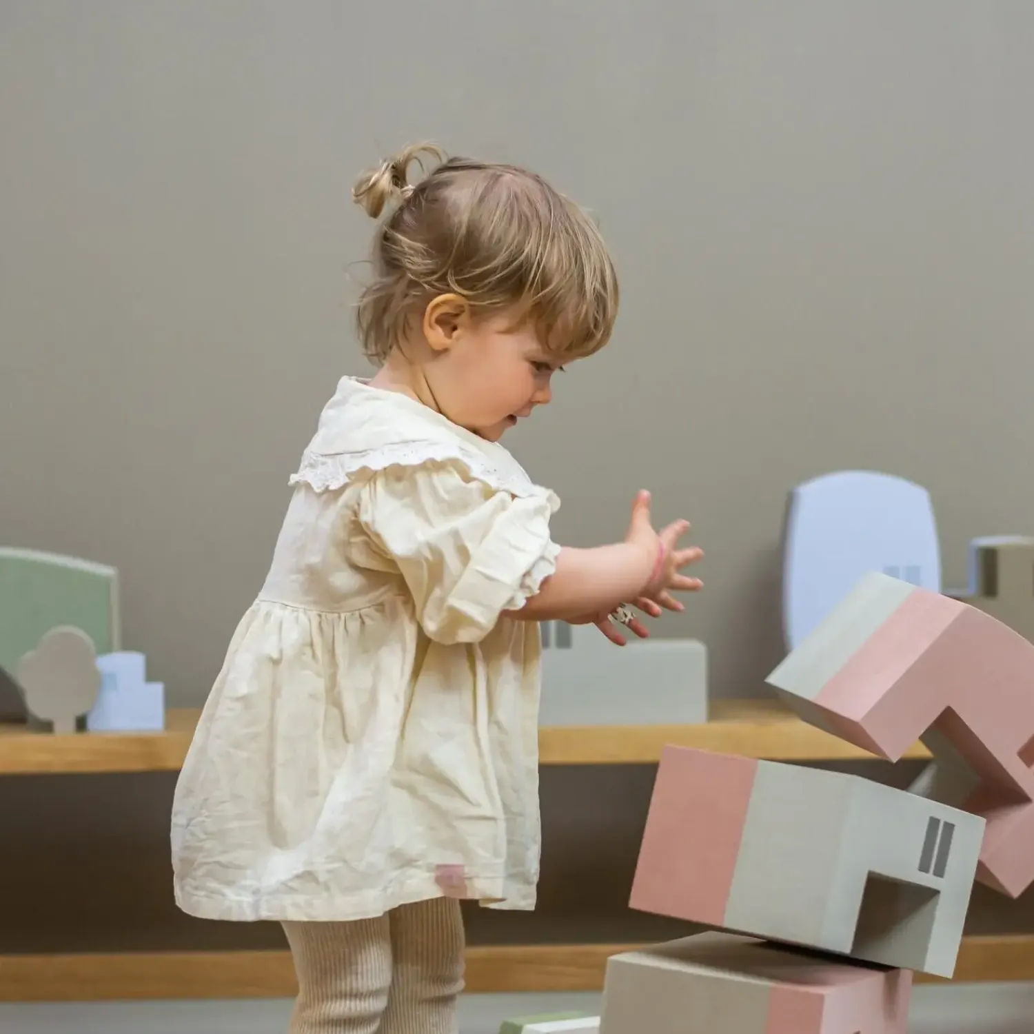 Town House Living fra bObles består af to separate dele, der giver dit barn fleksible muligheder for leg og sidde. Hver del kan bruges som en stabil skammel eller som en vippe-skammel, hvilket gør sættet alsidigt til forskellige aktiviteter i løbet af dagen.