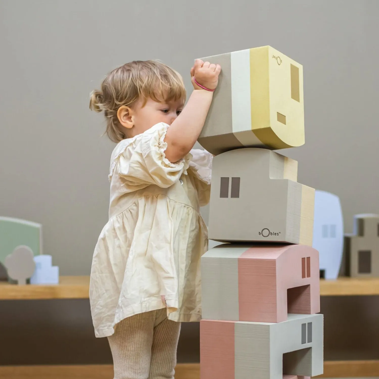 Vippefunktionen træner dit barns balance og koordination gennem leg. De simple geometriske former, der ligner vinduer og døre, stimulerer fantasien og inviterer til rollespil. Det er håndgribeligt legetøj, der kan indgå i mange forskellige lege, alt efter hvordan dit barn vælger at bruge det.