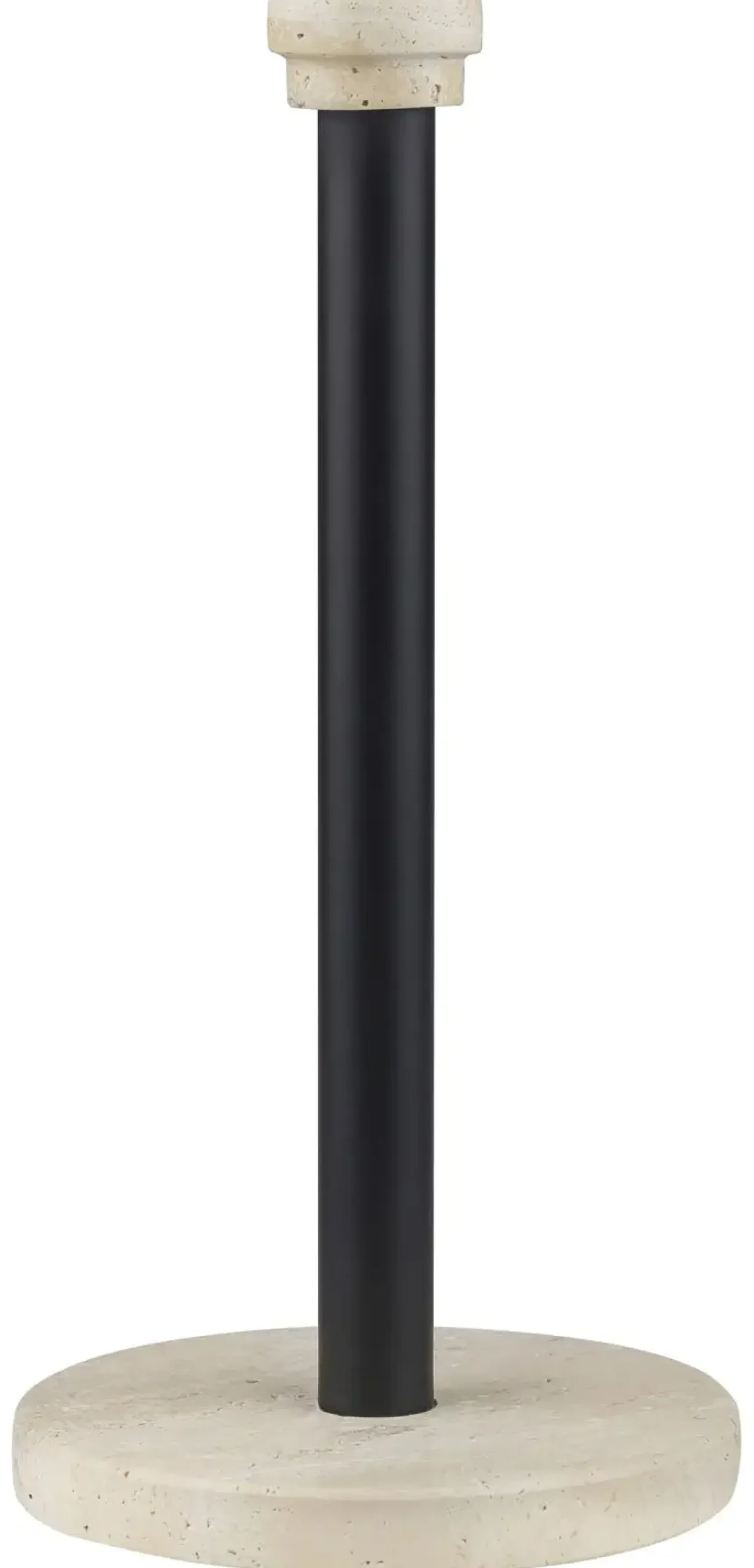 TRAVERTIN-køkkenrulleholderen fra Mette Ditmer kombinerer funktionalitet og æstetik på smukkeste vis. Den er fremstillet med en base og knop i travertin, der med sine naturlige mønstre og unikke struktur tilføjer et varmt og organisk udtryk til dit køkken.Den slanke stang er lavet af sort pulverlakeret metal, der komplementerer travertinens naturlige farvetoner. Holderens robuste konstruktion og tunge base sikrer stabilitet og gør den både praktisk og elegant.