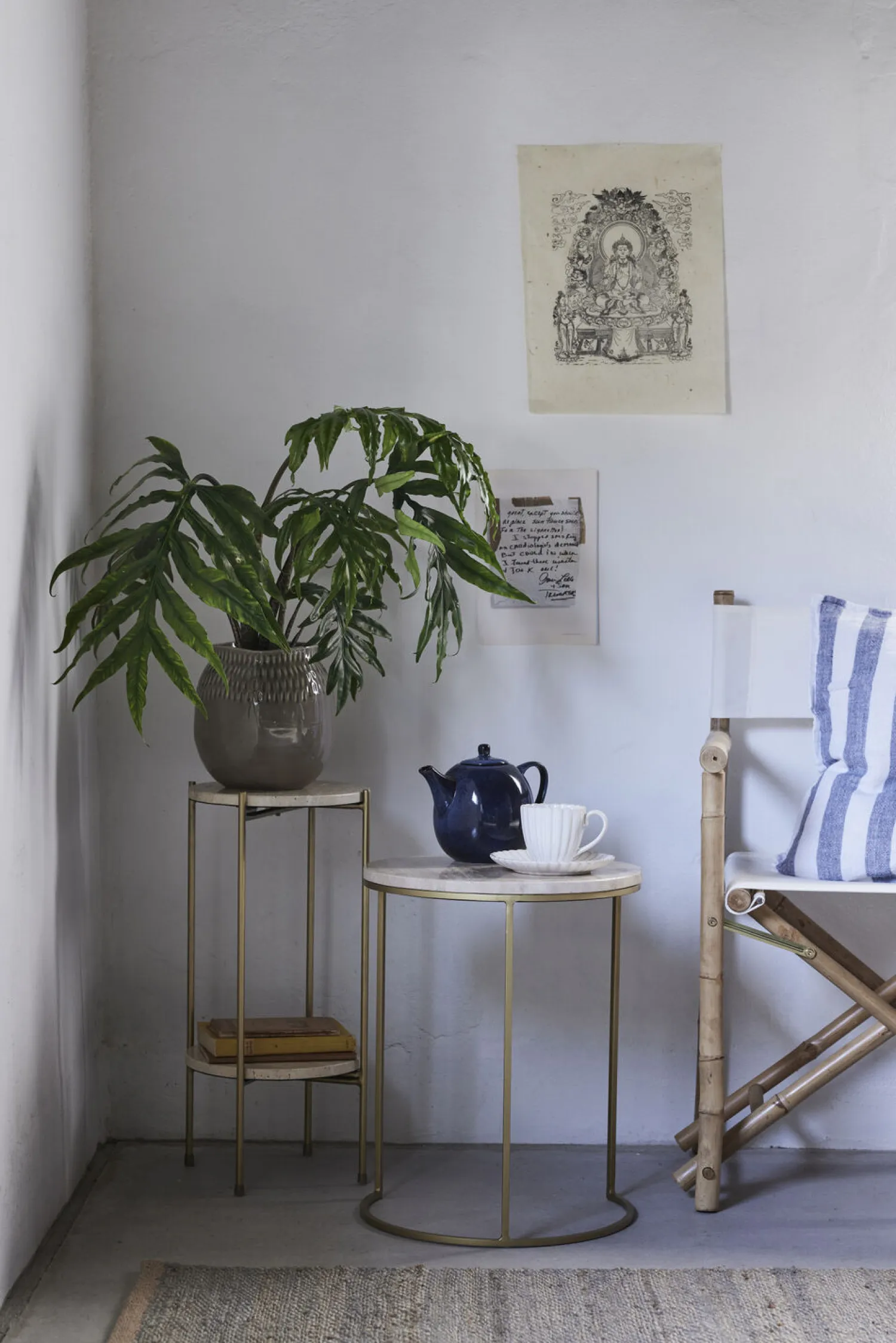 Dette 2 sæt alsidige bord har en bordplade i travertin, der giver dit rum en tidløs, men alligevel moderne stemning. Bordbenene i jern har en iøjnefaldende guldfinish, som skaber en smuk kontrast til bordpladen. Dette piedestalbord er perfekt til ethvert rum og vil være et flot statement i din stue, spisestue eller på kontoret. Uanset om du er på udkig efter et møbel til din eksisterende indretning eller noget, der kan starte en ny stiltrend, er Traville piedestalbordet det perfekte valg.