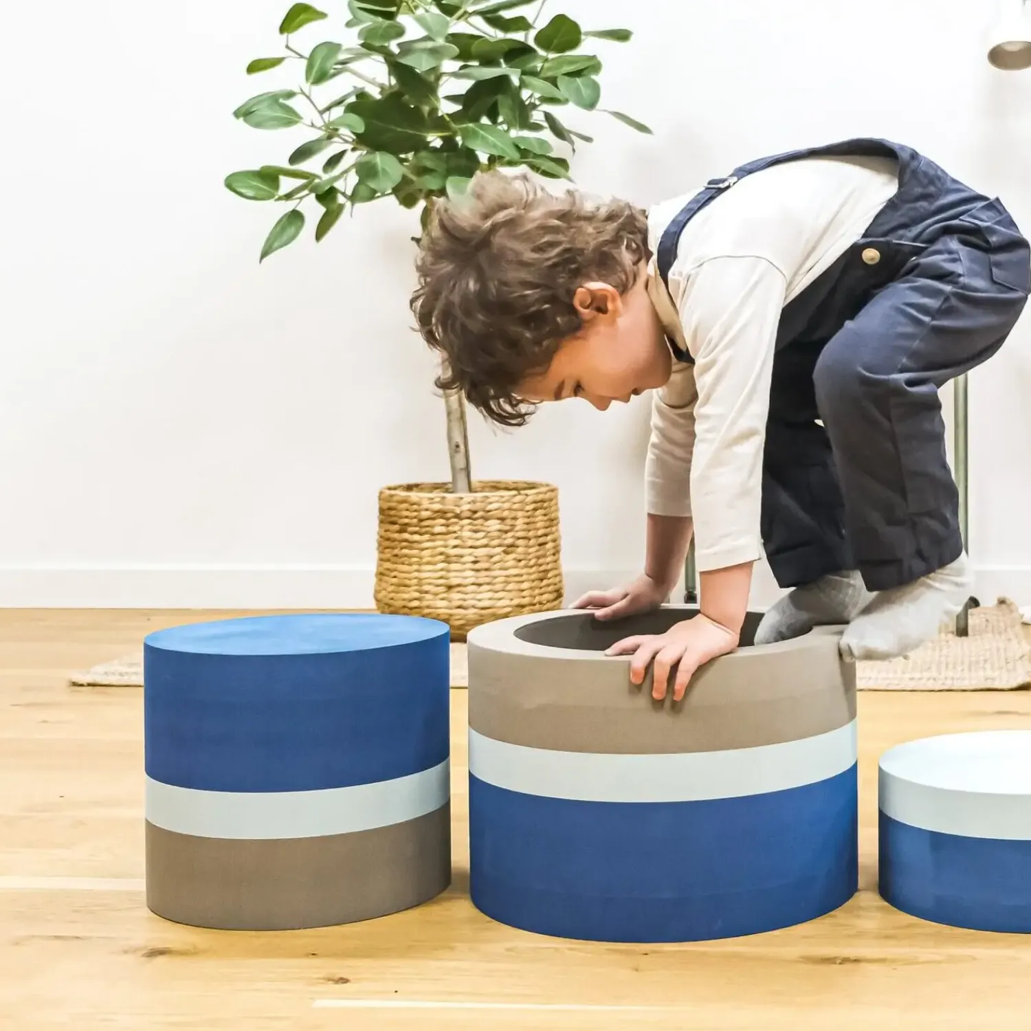 De to komponenter – cylinderen og røret – kan bruges sammen eller hver for sig, hvilket giver fleksibilitet i legen. Strukturen inviterer til klatring, gynge og rullende aktiviteter. Det blå materiale udgør 60 % af produktet og giver en rolig farvetone, der passer ind i hjemmet.