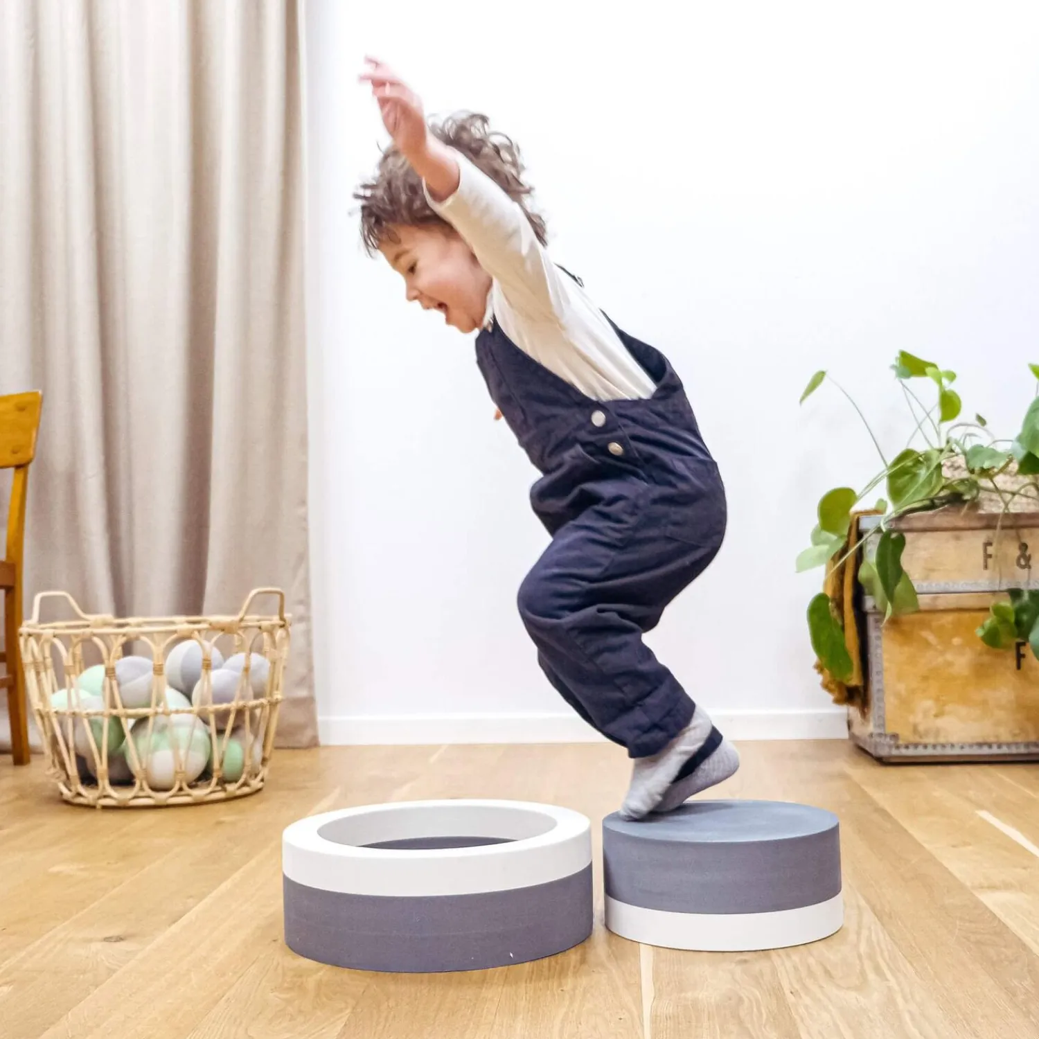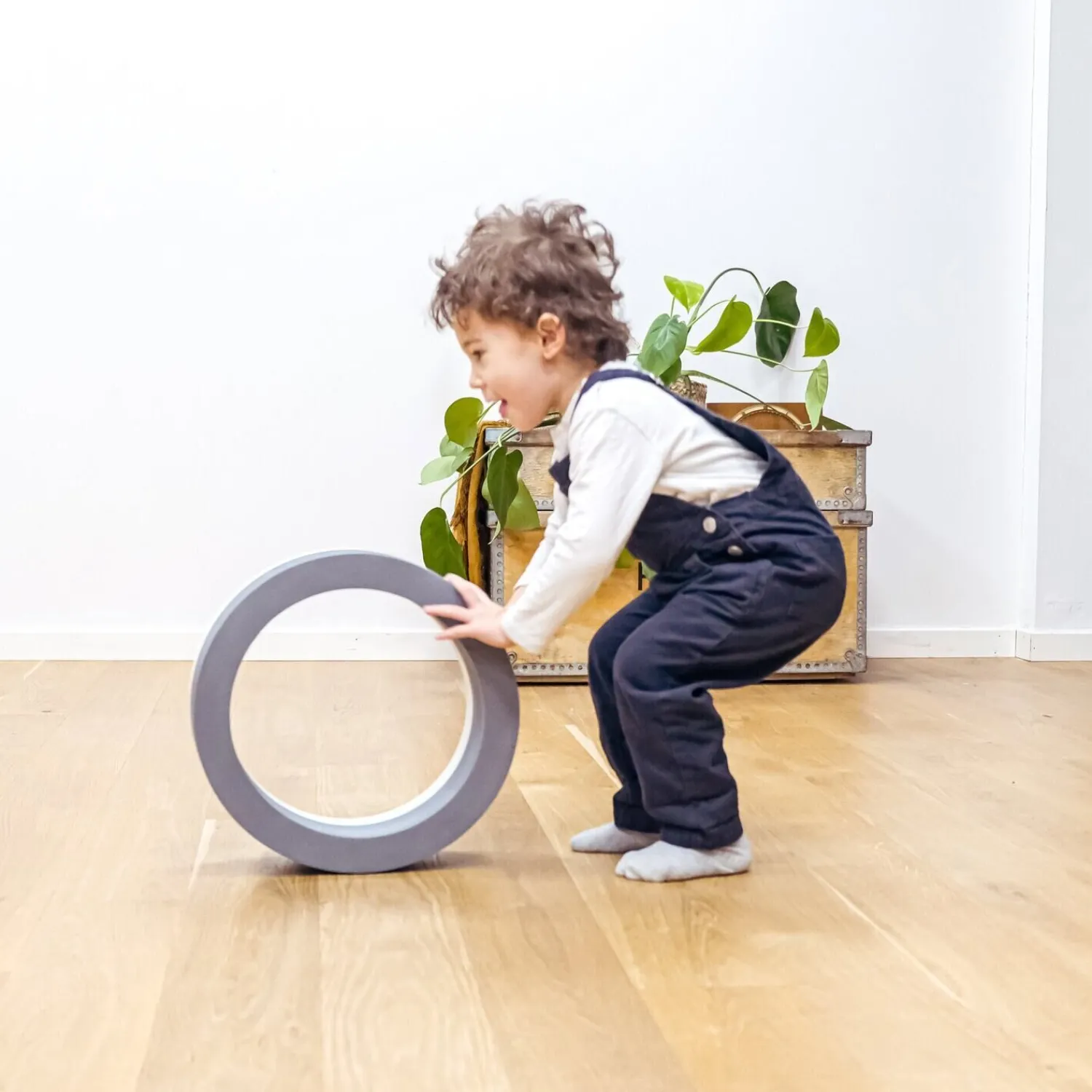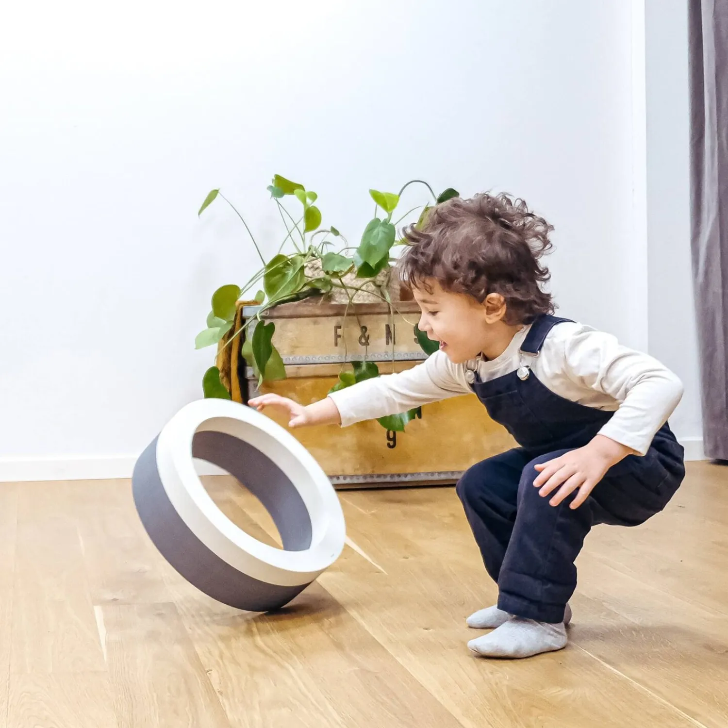 Dette tumlerør fra bObles består af en cylinder med et hult center, designet til at invitere børn til aktiv leg. Den grå farve, kombineret med hvid, giver et stilfuldt udtryk, der passer ind i de fleste hjem. Produktet styrker barnets motoriske færdigheder gennem bevægelse, balance og kreativ udfoldelse.
