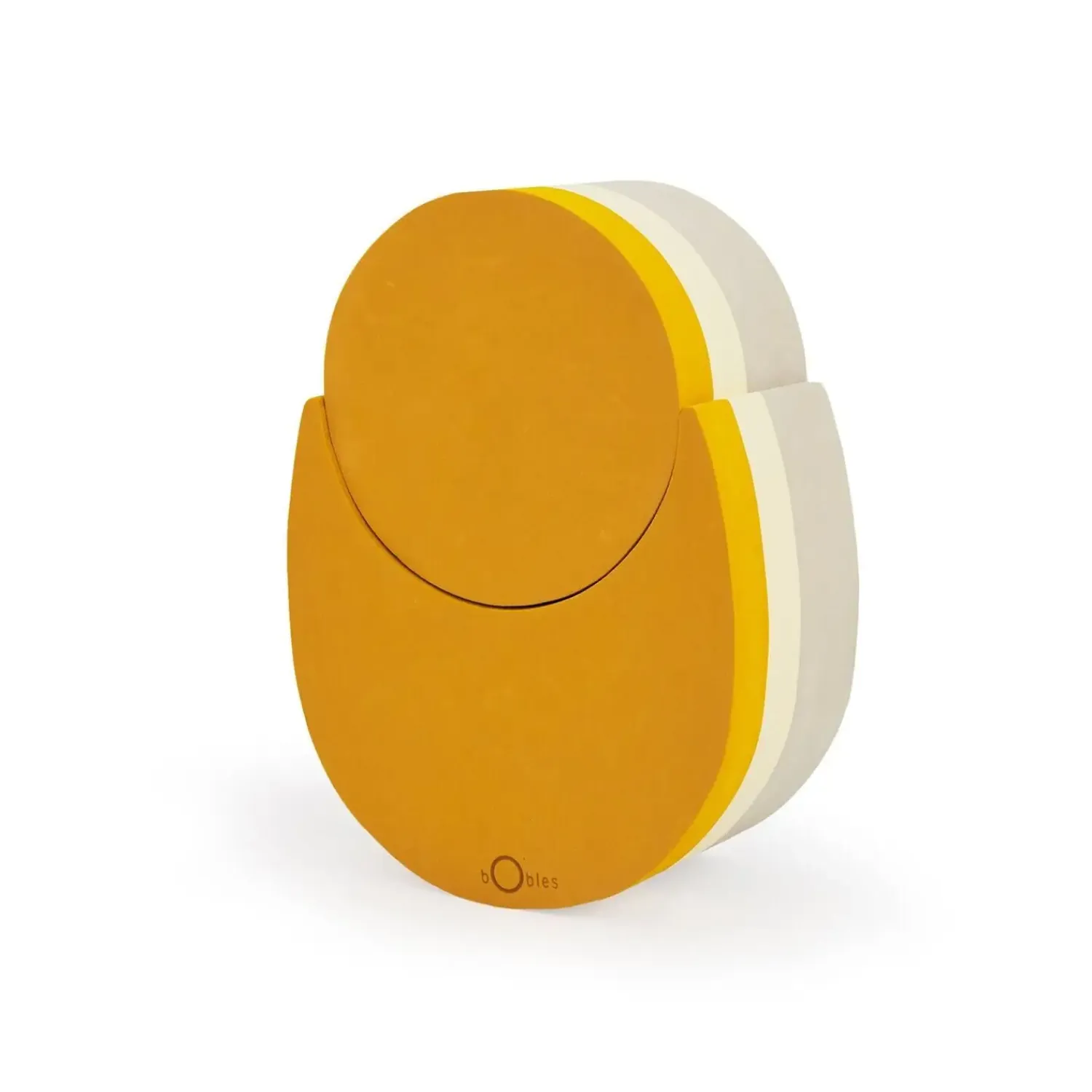 Tumleægget fra bObles består af to separate dele, der giver dit barn flere måder at lege og udforske på. Den æggeformede struktur har en flad, rund top og en buet bund, hvilket skaber bevægelse og udfordrer balancen. Farverne er orange, gul og beige.