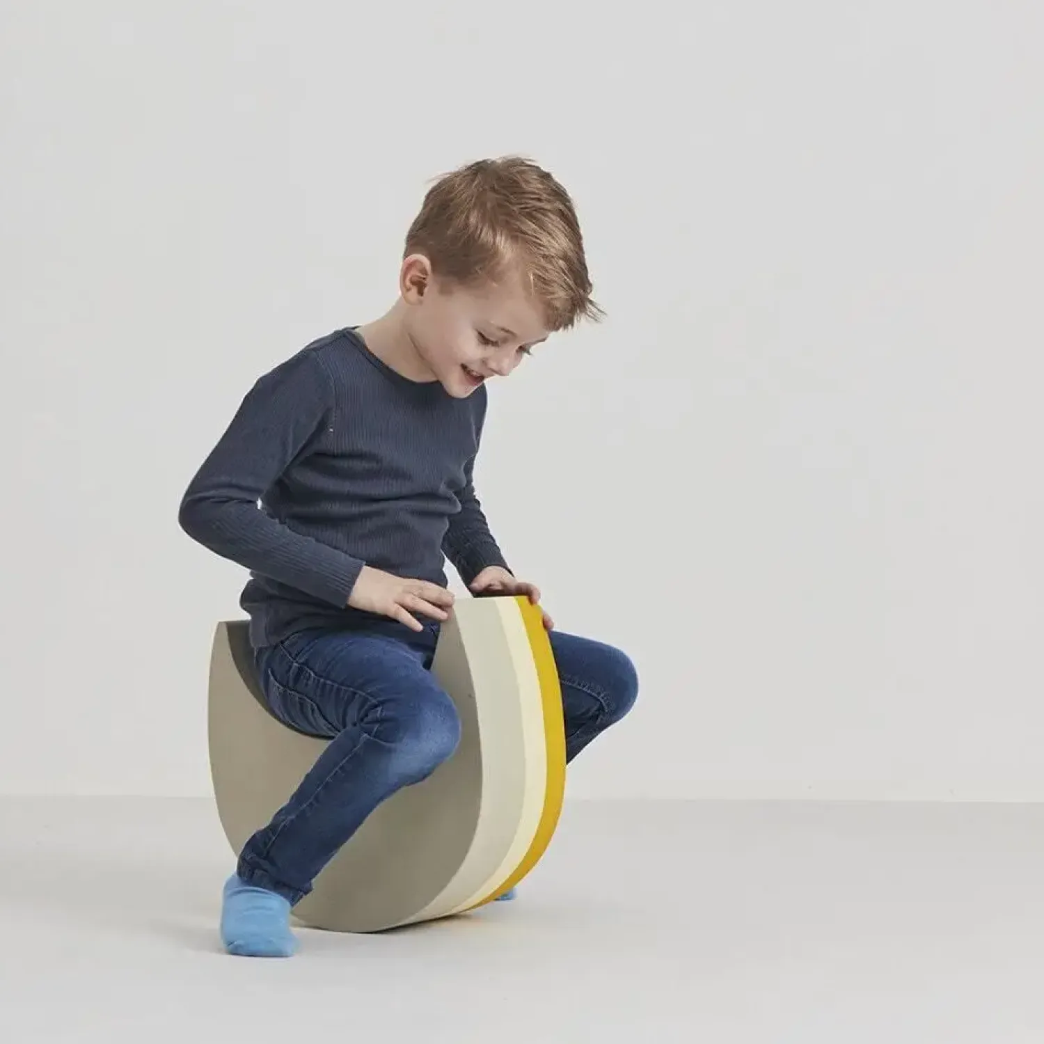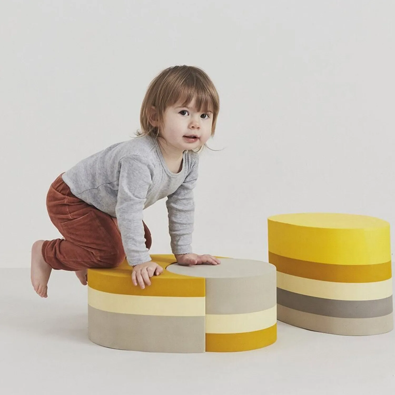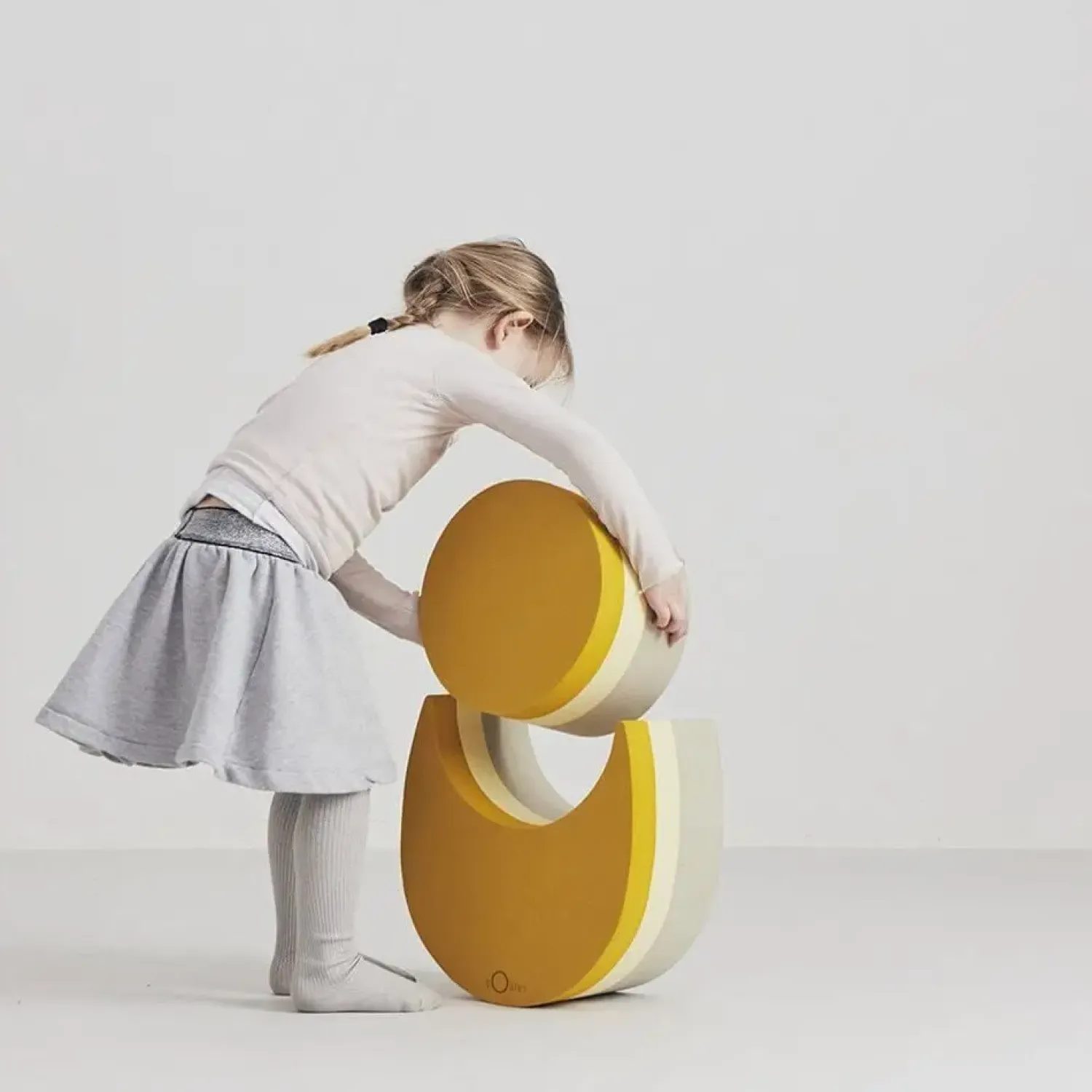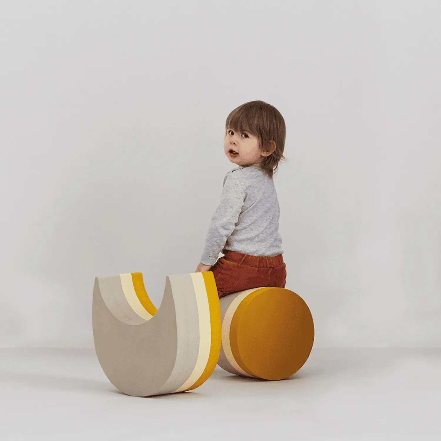 De to dele åbner for fantasifuld leg, hvor dit barn selv bestemmer, hvordan legetøjet bruges. Det kan være en gyngestol, en bro, et bord eller noget helt tredje. Farvekombinationen af orange, gul og beige stimulerer synet, mens den simple form gør det let at integrere i forskellige legeaktiviteter.