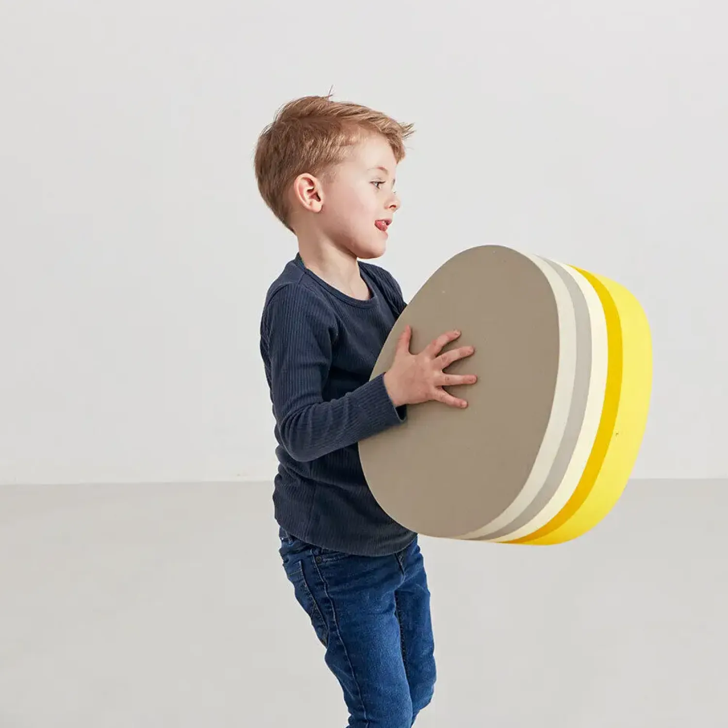 Den æggeformede, runde profil gør Tumleægget sikkert at lege med, da der ikke er skarpe kanter. Formen inviterer til tumling, balance og koordinationsøvelser, hvilket hjælper dit barn med at udvikle kropsbevidsthed. Produktet er lavet af flerfarvet materiale, der tåler aktiv leg og daglig brug i hjemmet.