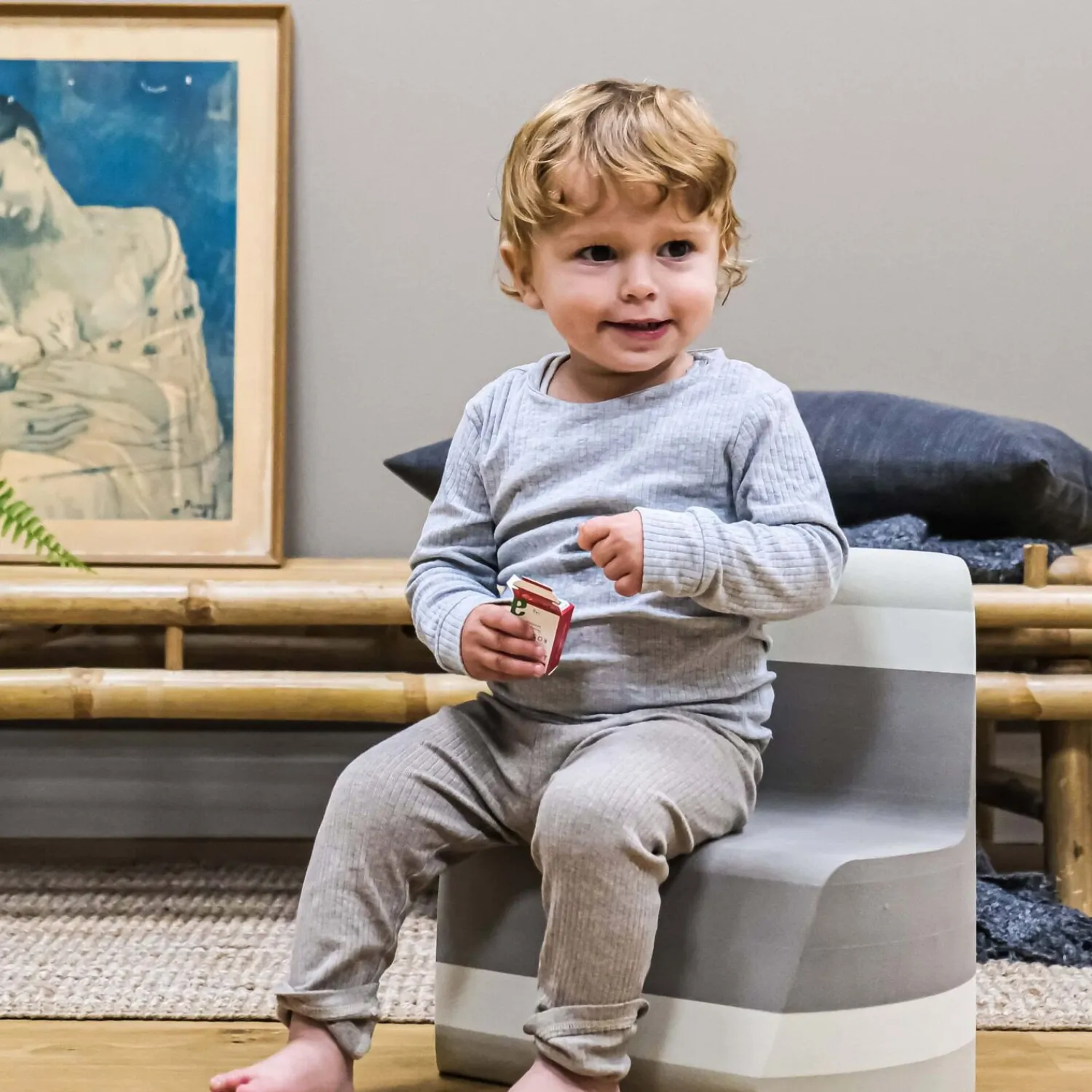 Bobles – Twin Grey er en børnestol med en sædehøjde på 18 cm, designet til små børn. Den er fremstillet af let EVA-skum, som gør den nem at flytte rundt i hjemmet. Stolen har et buet design i grå farve med hvide striber, og den er en del af bObles cirkelserie.